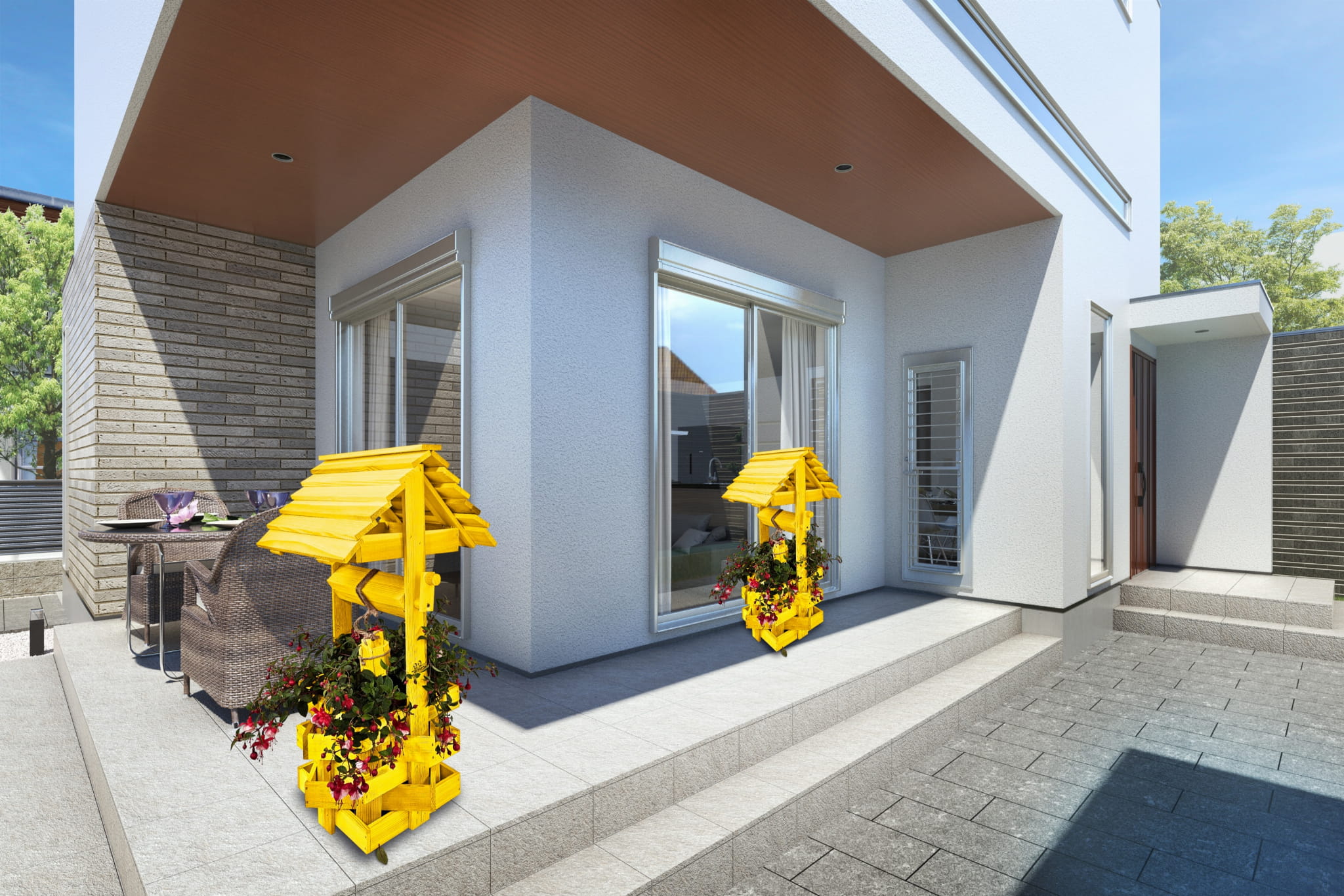Do studni dołączona jest drewniana doniczka na kwiaty, utrzymana w tej samej estetyce, tworząc spójną i harmonijną całość.