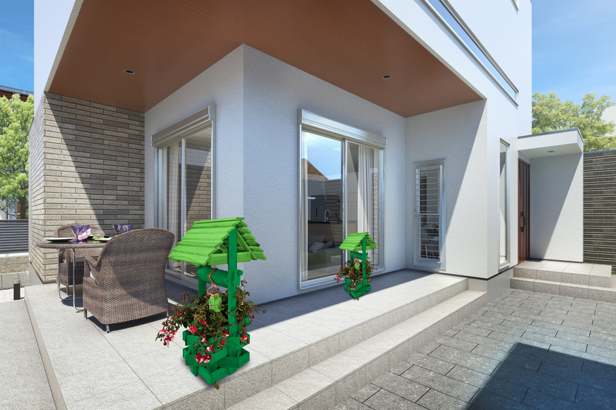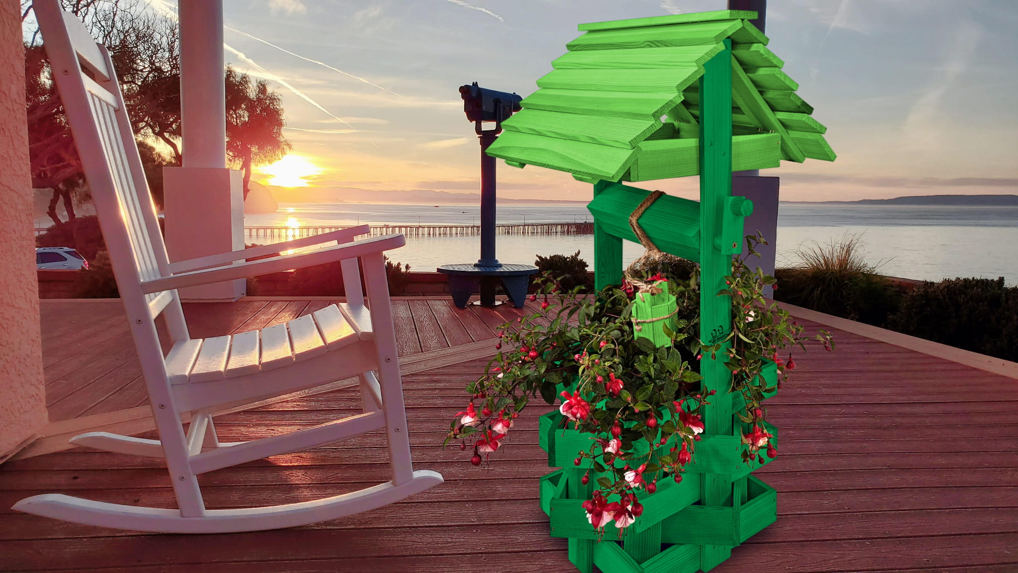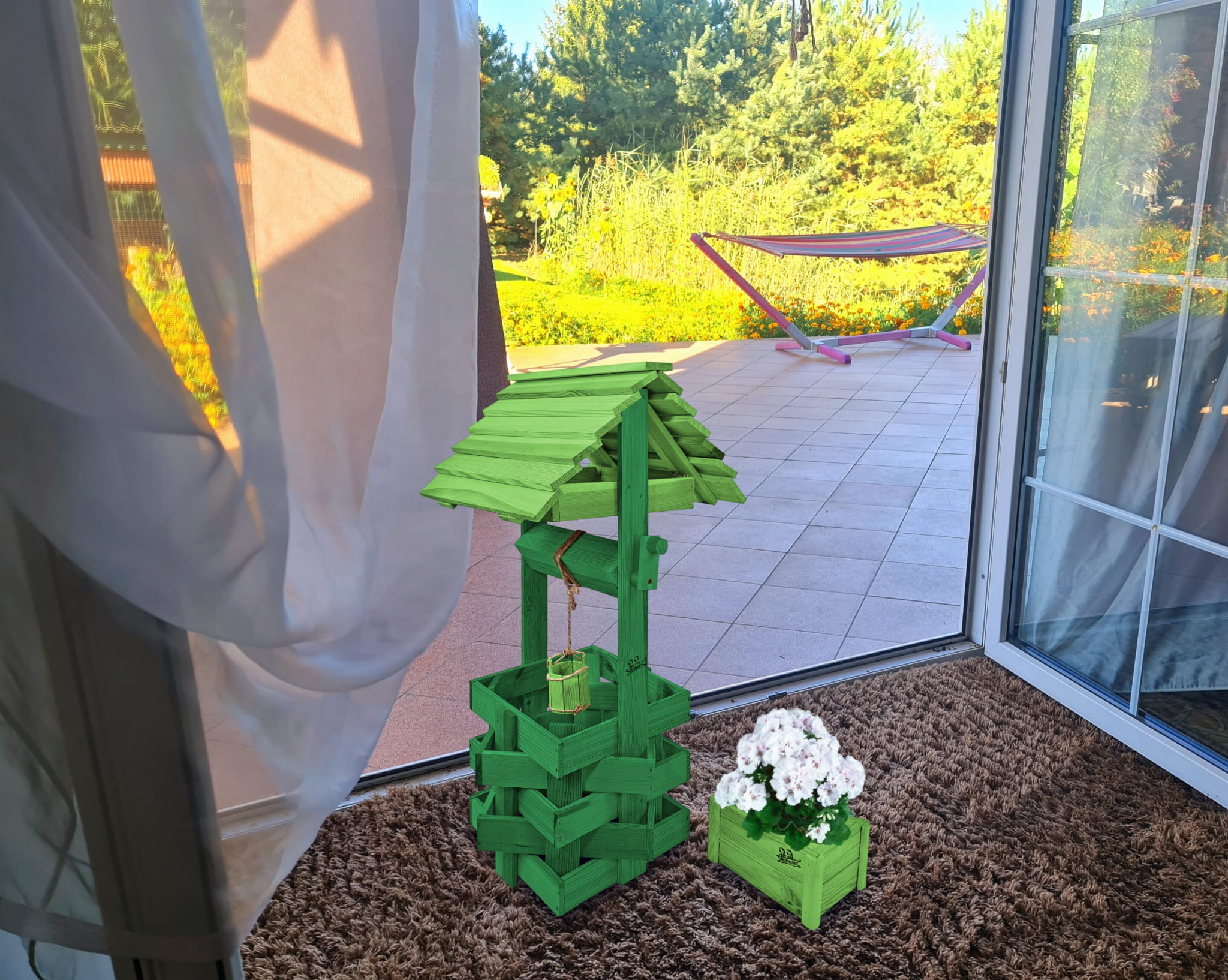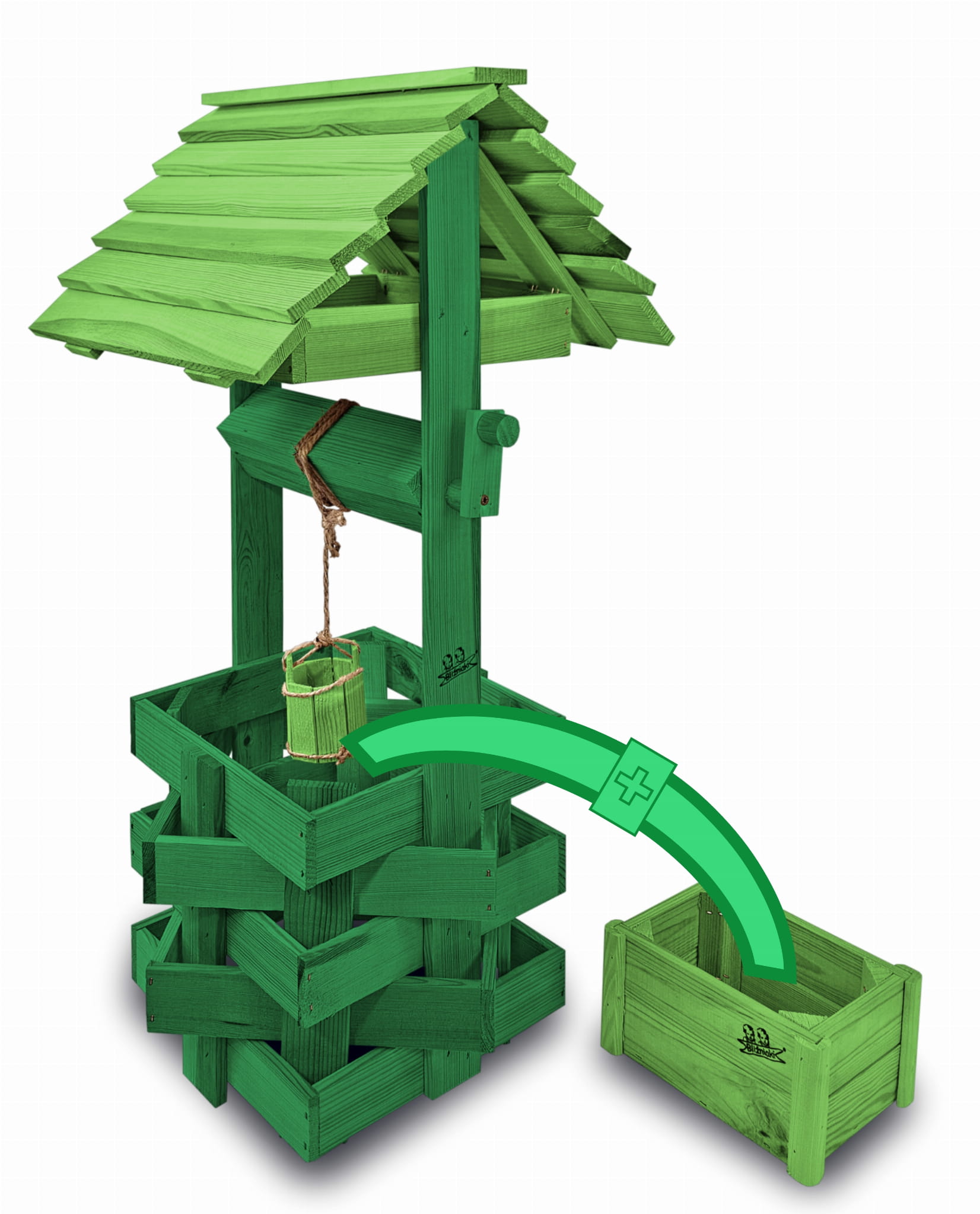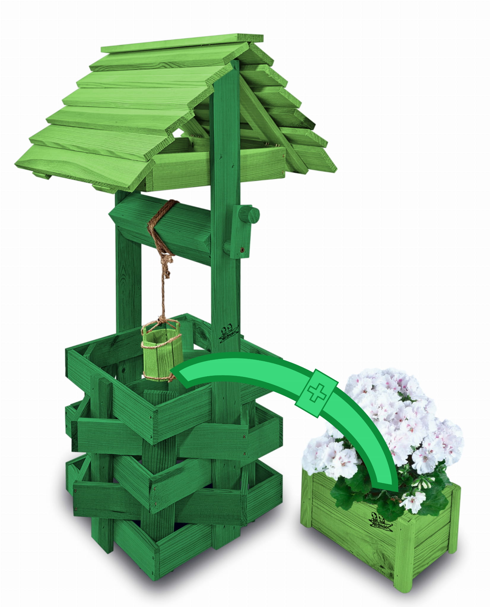 Do studni dołączona jest drewniana doniczka na kwiaty, utrzymana w tej samej estetyce, tworząc spójną i harmonijną całość.
