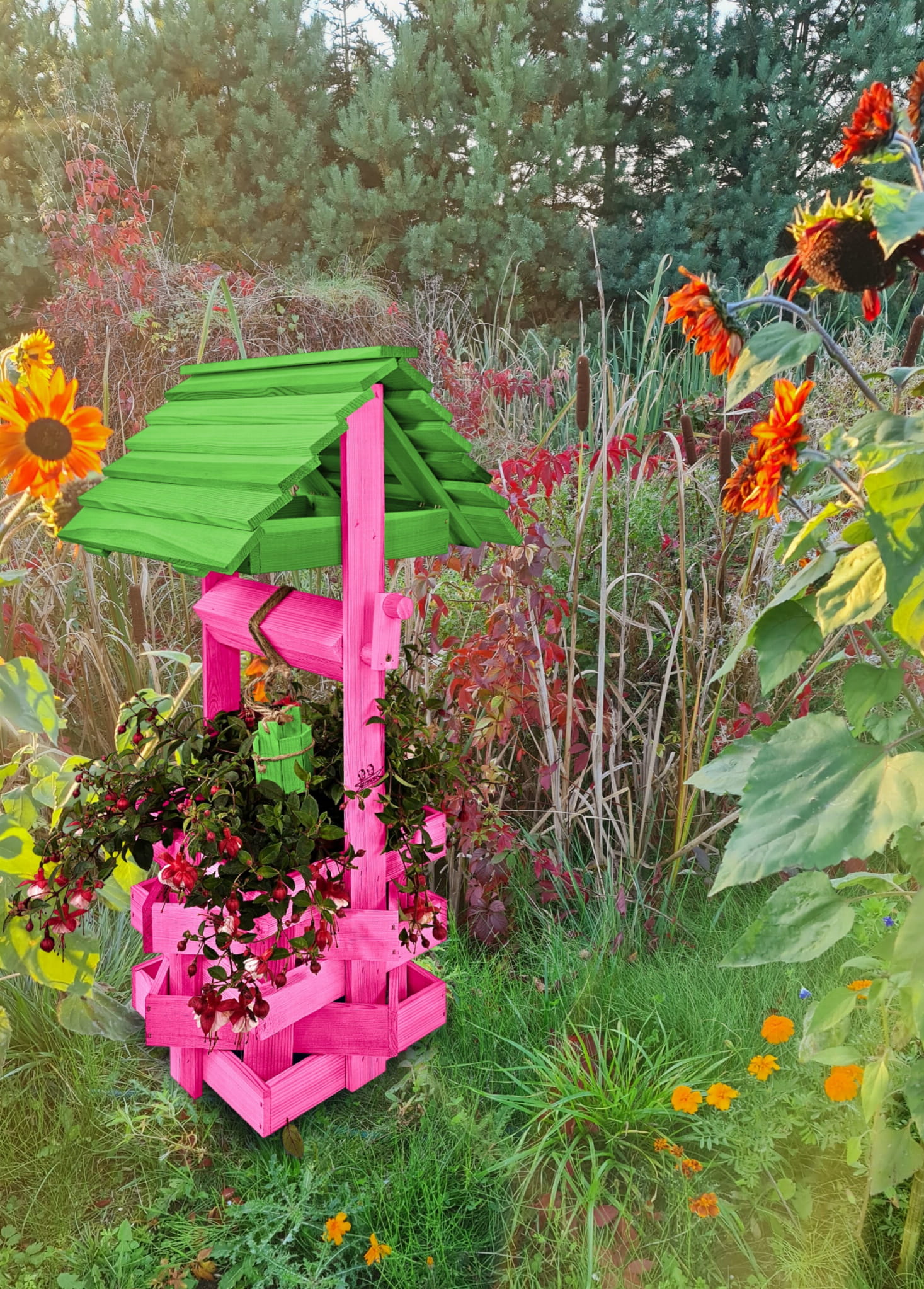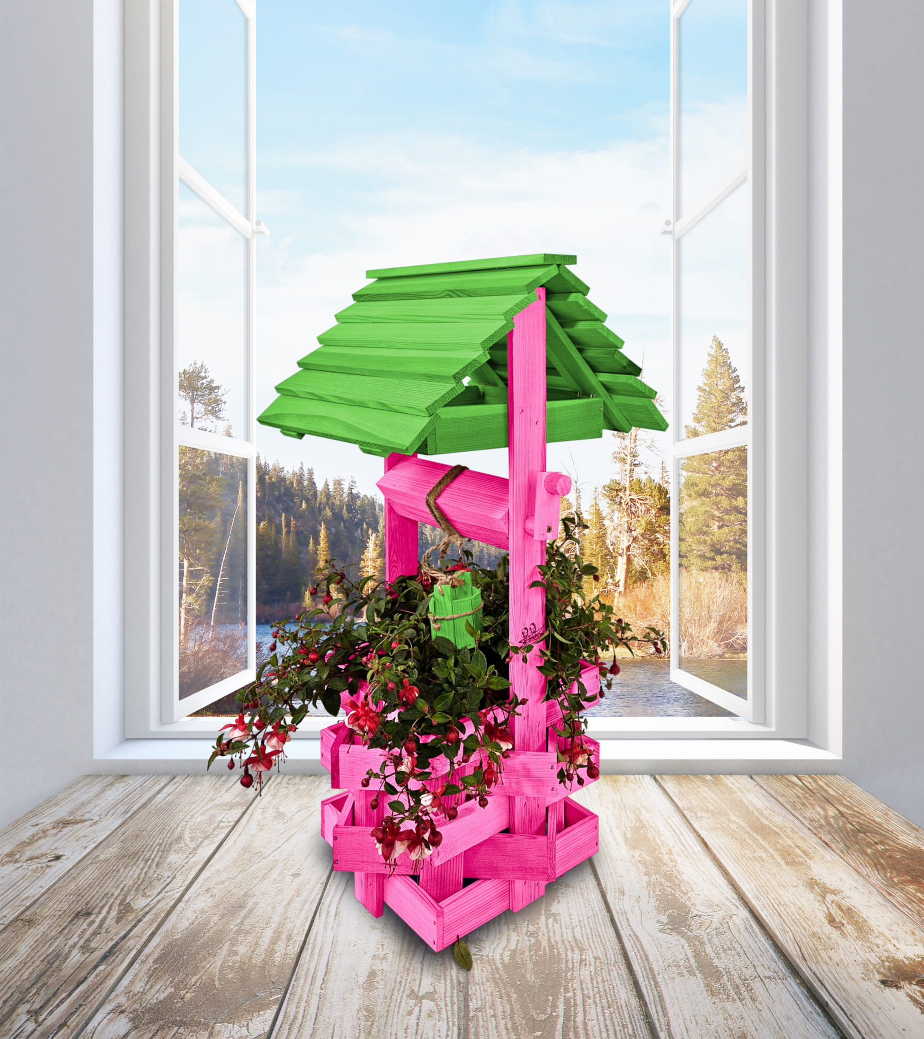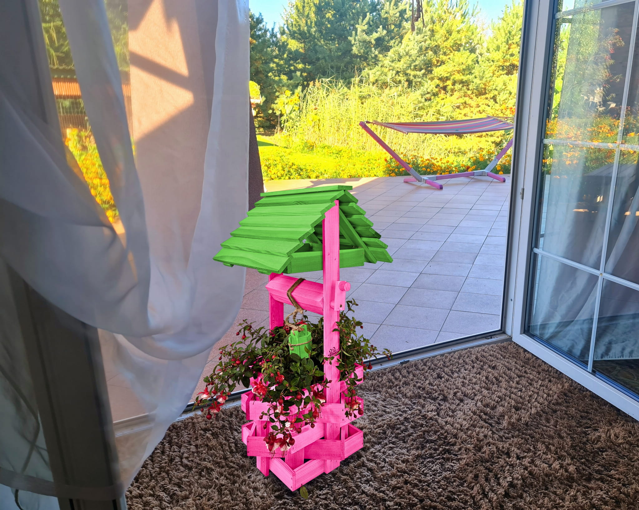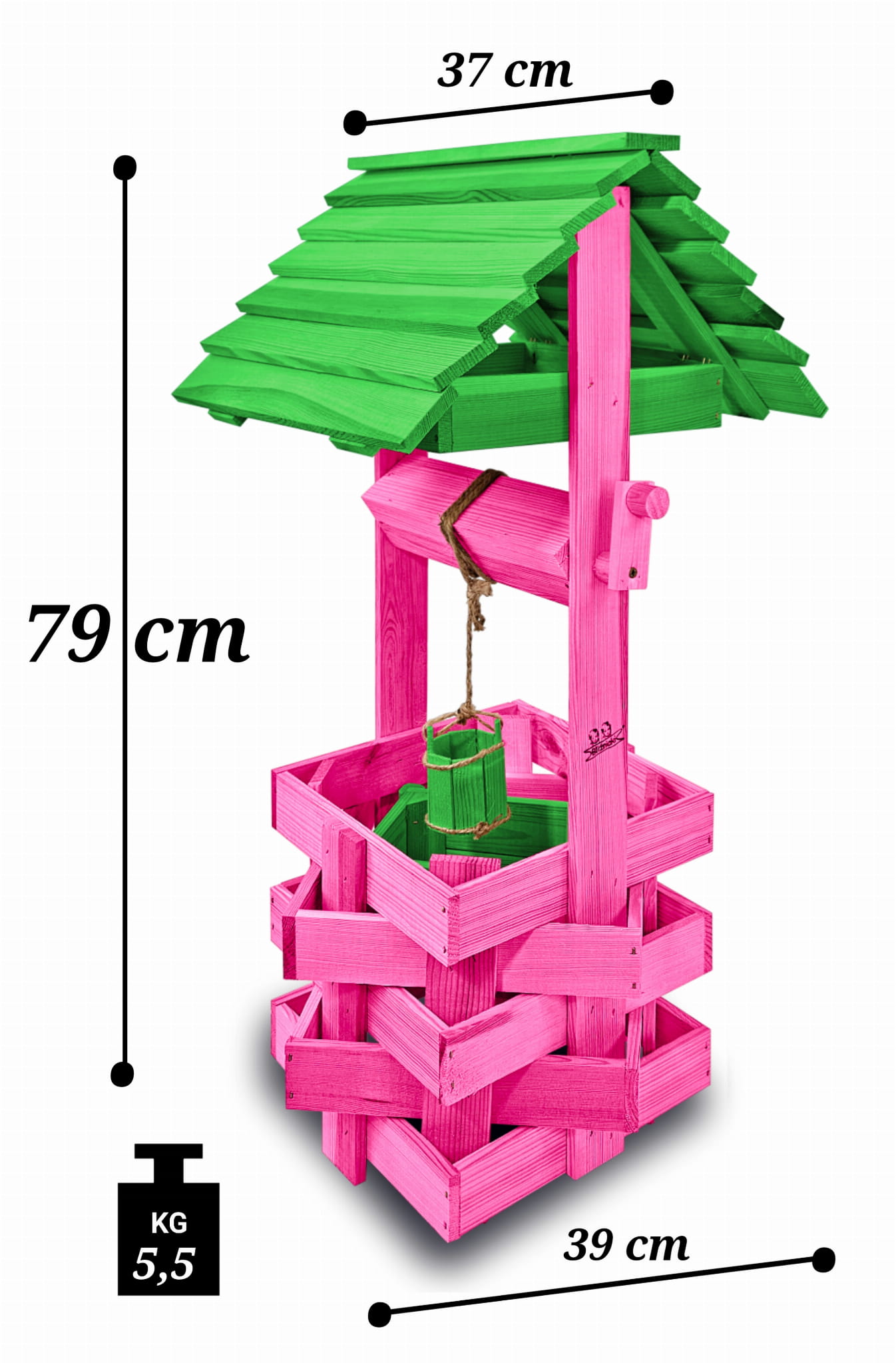 Studnia ogrodowa drewniana Figura Ogrodowa Donica na kwiaty do Domu i Ogrodu Studnie Balkonowe Tarasowe Studzienka na peralgonie Kwietnik Kolor RÓŻOWO ZIELONY Prezent Studzienki ozdobne OZDOBA WNĘTRZ I OGRODU SC1 RÓP ZZ