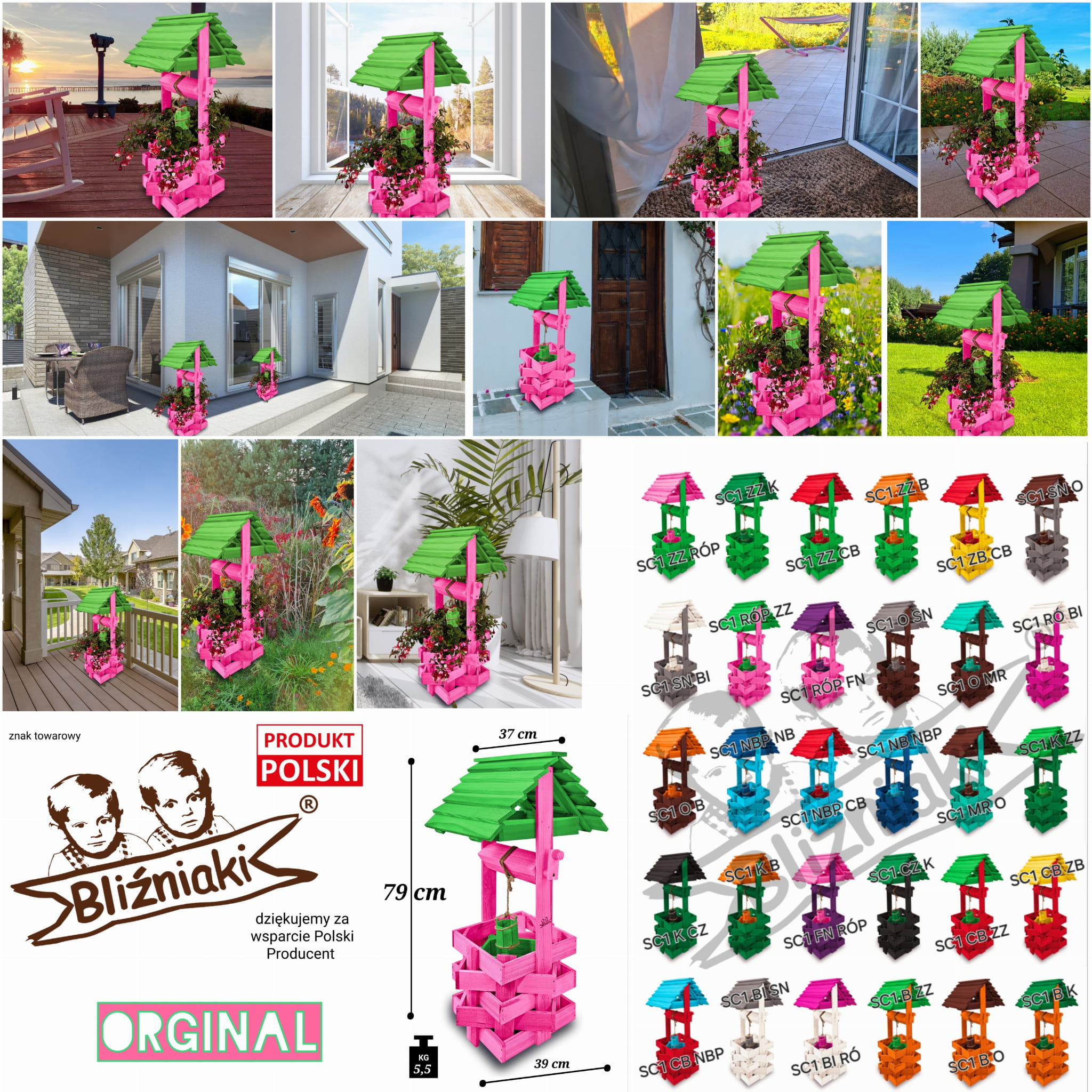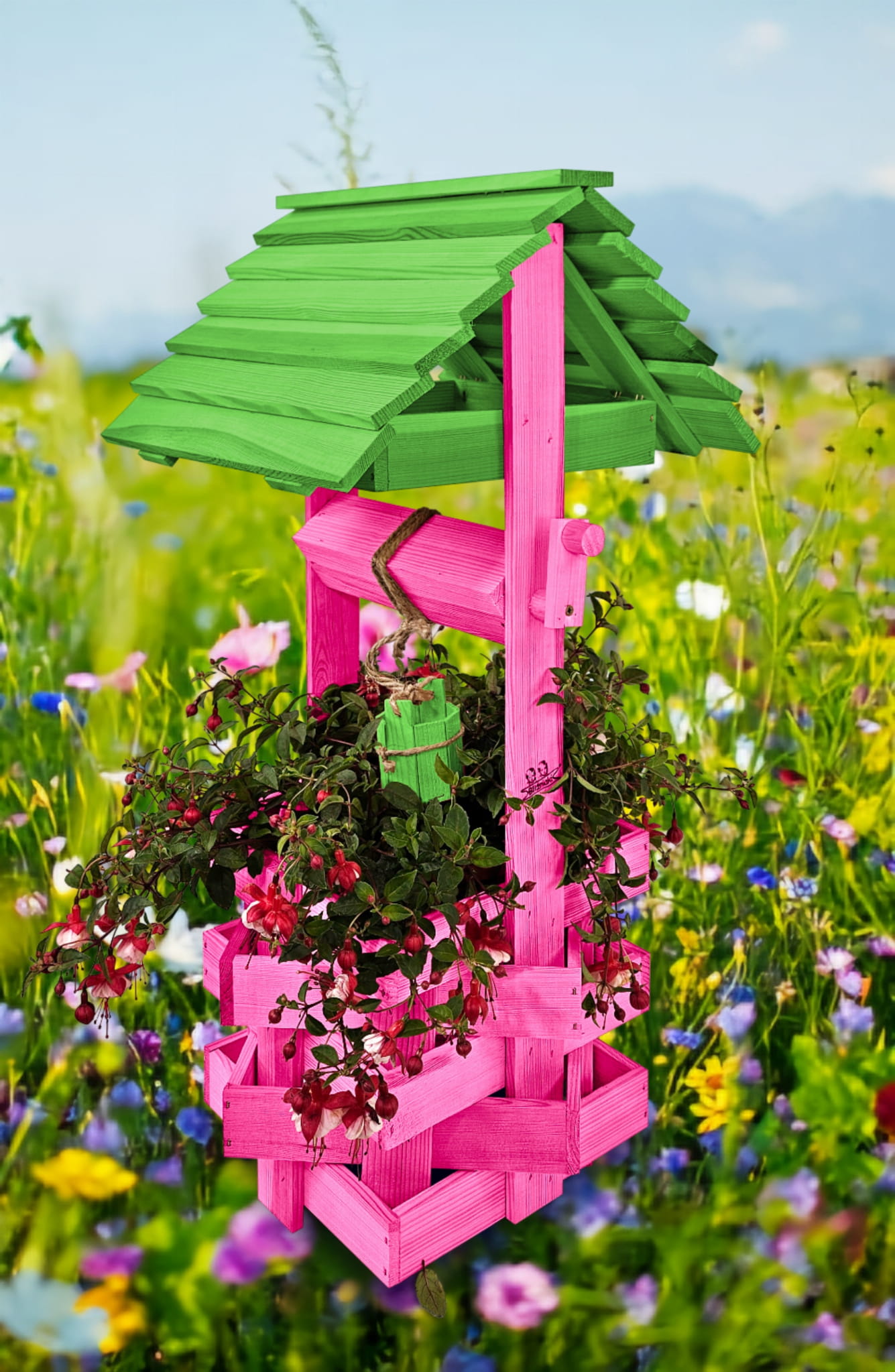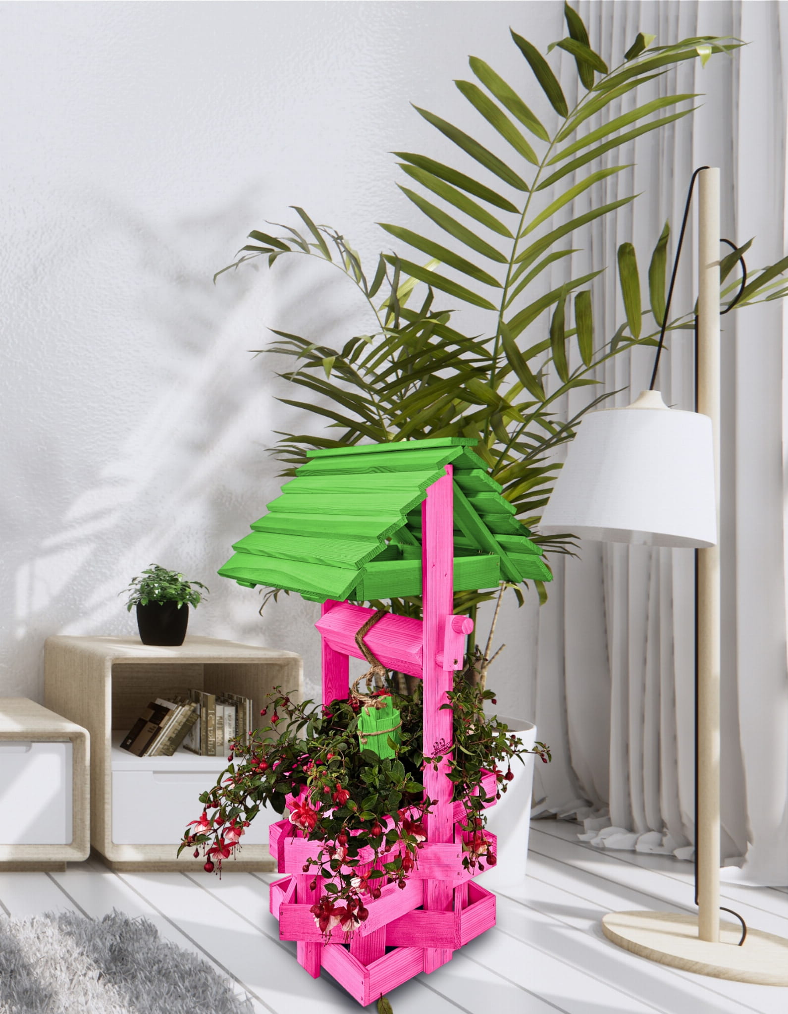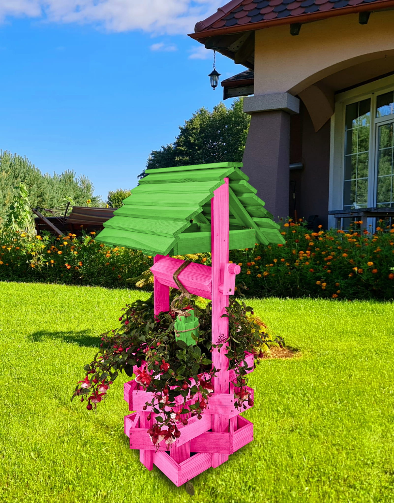 Studnia ogrodowa drewniana Figura Ogrodowa Donica na kwiaty do Domu i Ogrodu Studnie Balkonowe Tarasowe Studzienka na peralgonie Kwietnik Kolor RÓŻOWO ZIELONY Prezent Studzienki ozdobne OZDOBA WNĘTRZ I OGRODU SC1 RÓP ZZ