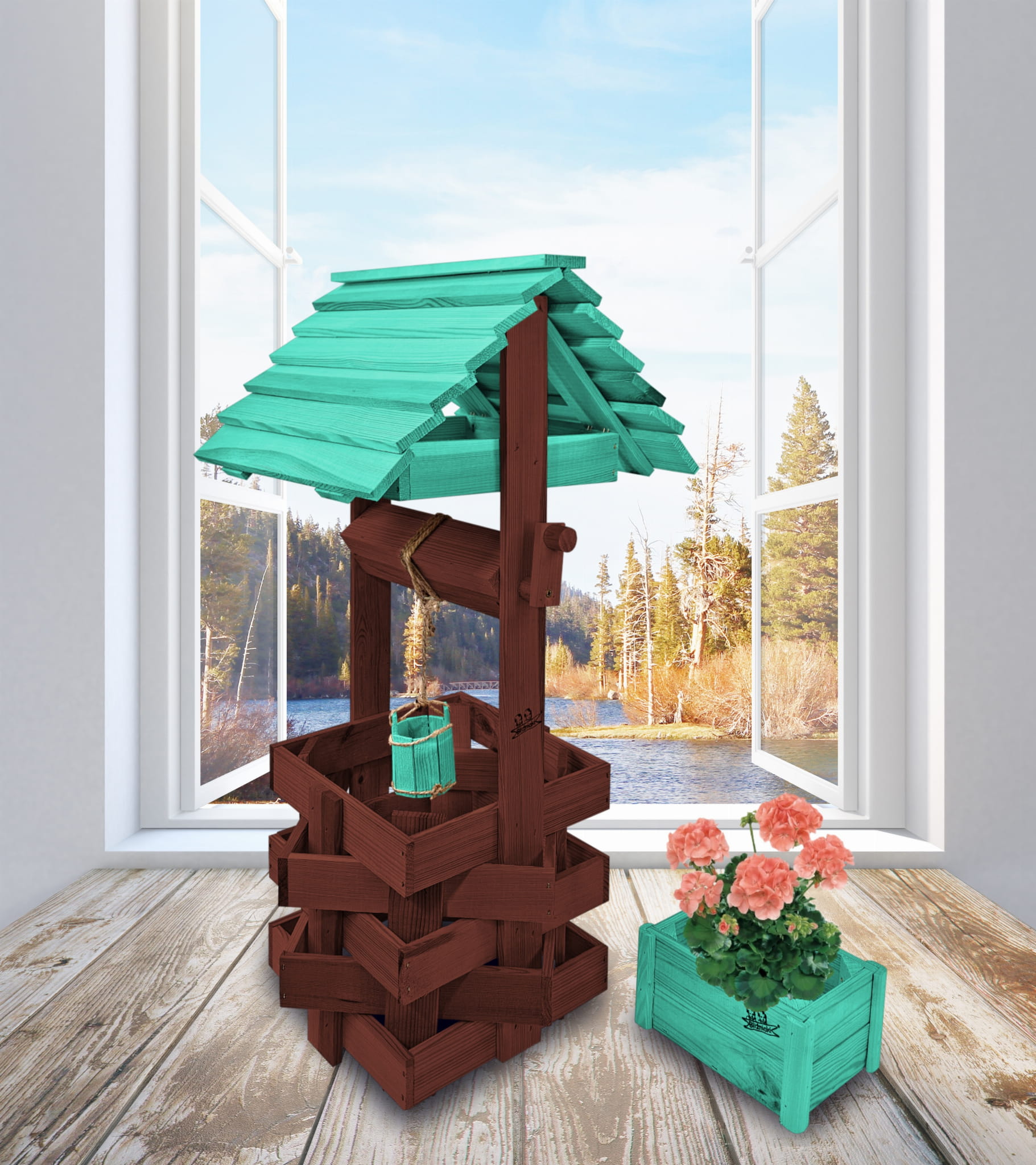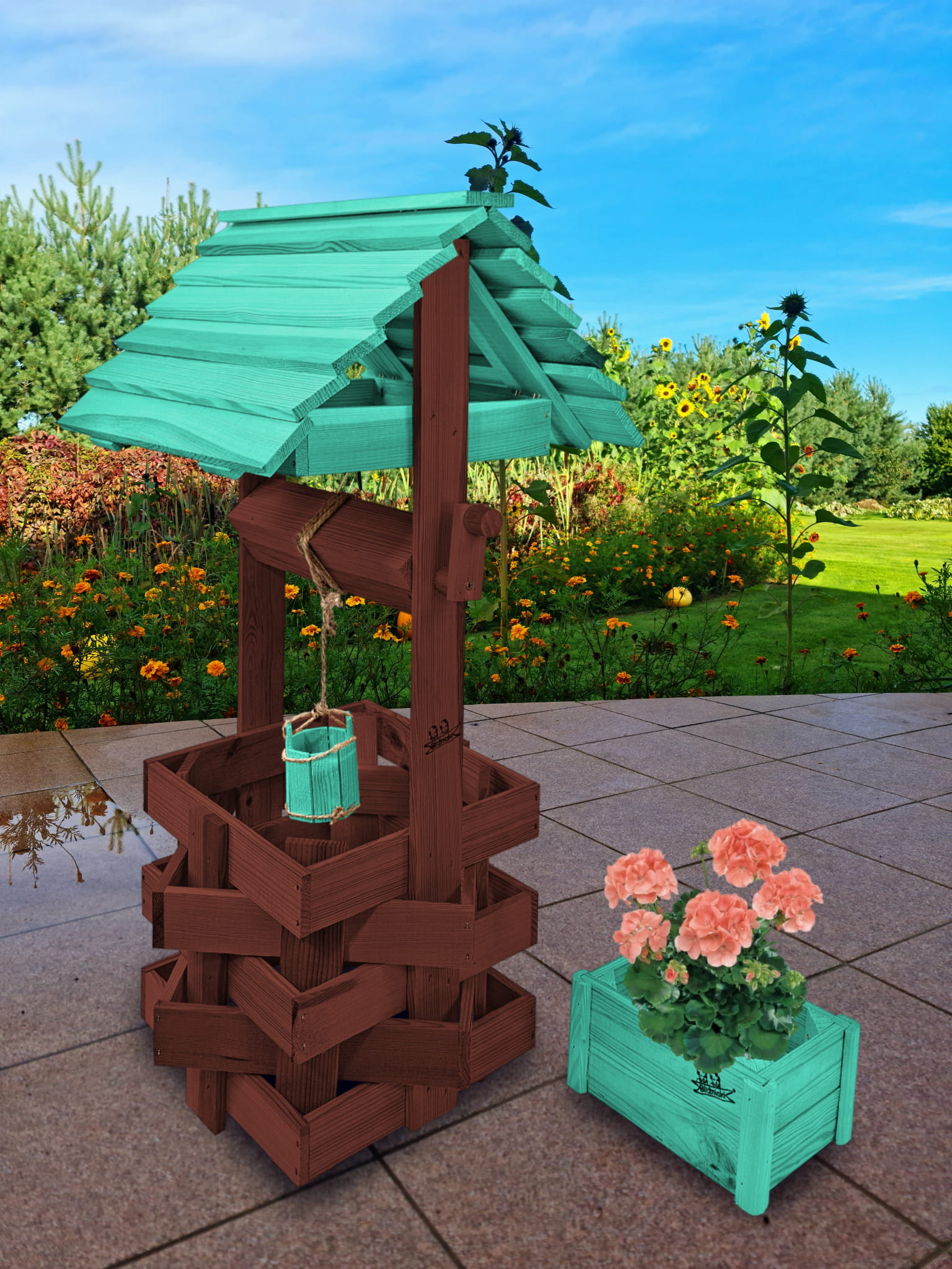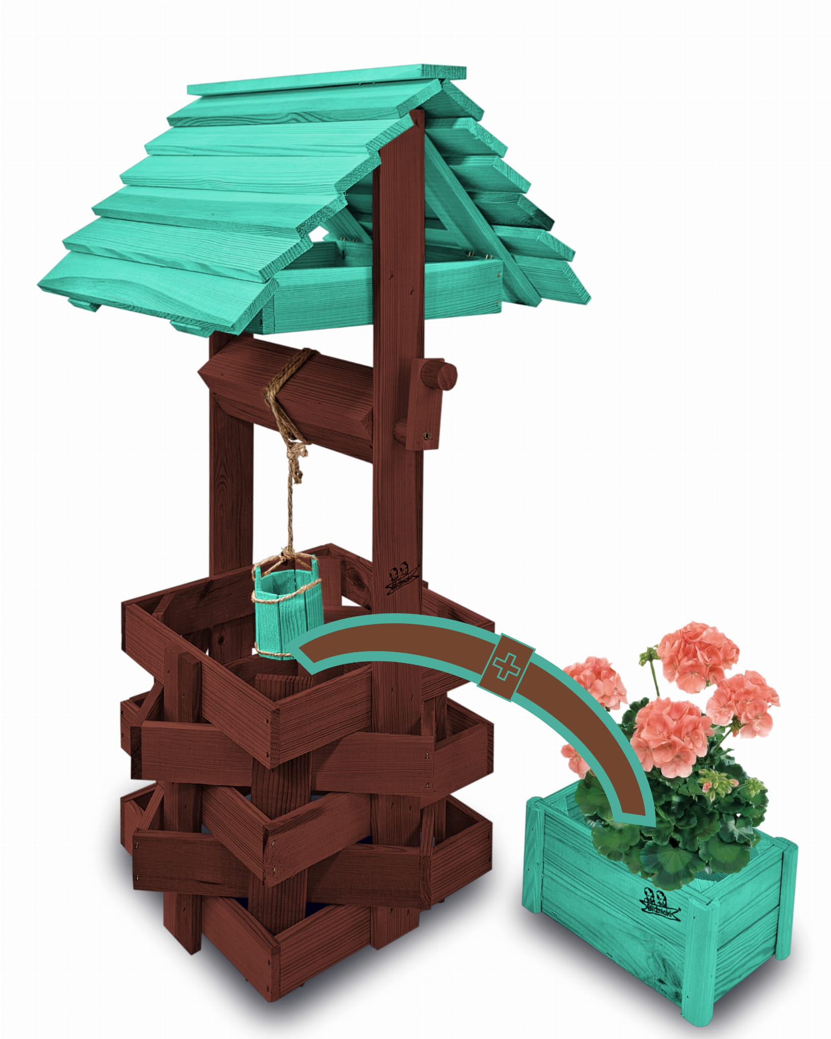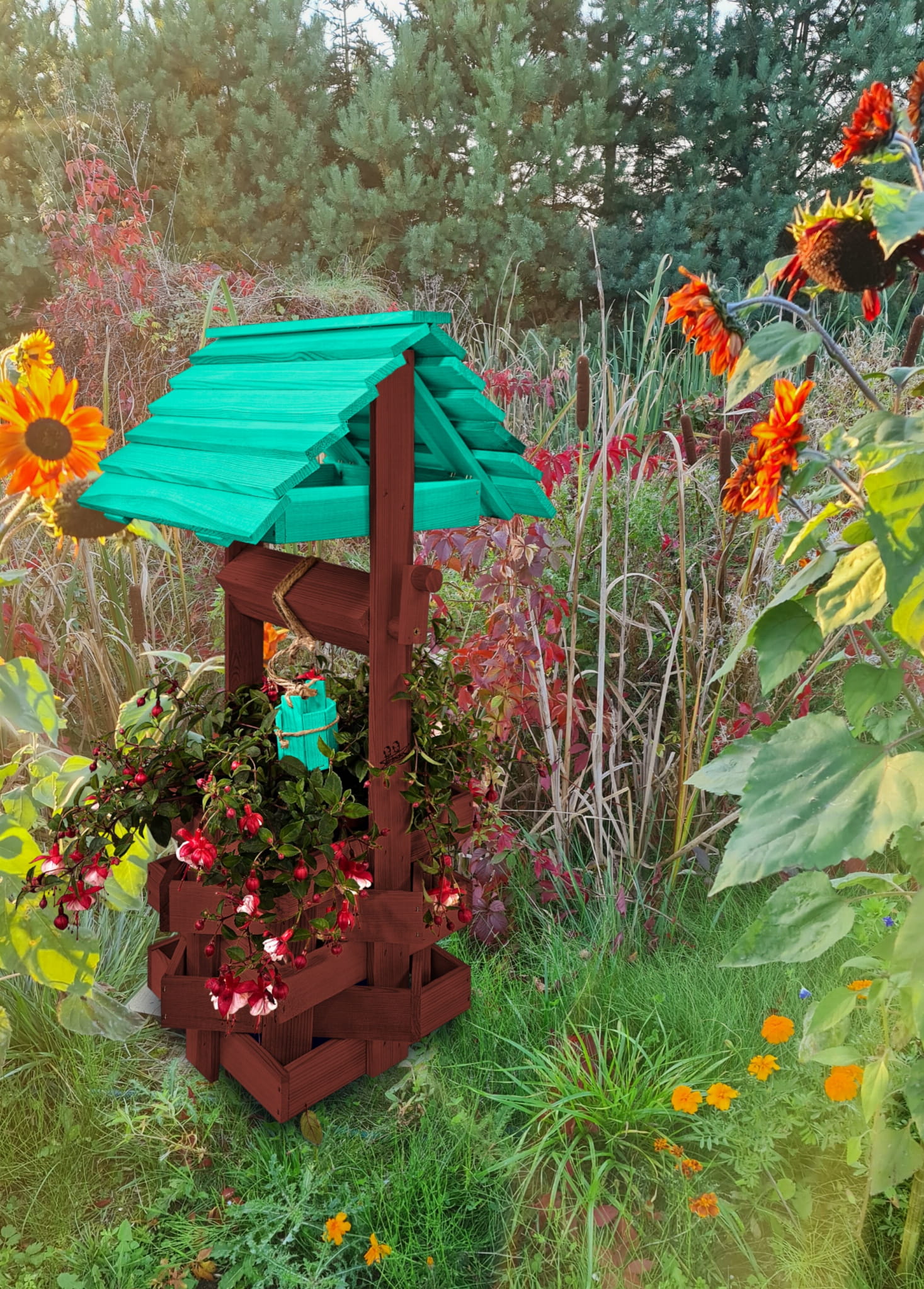 Do studni dołączona jest drewniana doniczka na kwiaty, utrzymana w tej samej estetyce, tworząc spójną i harmonijną całość.