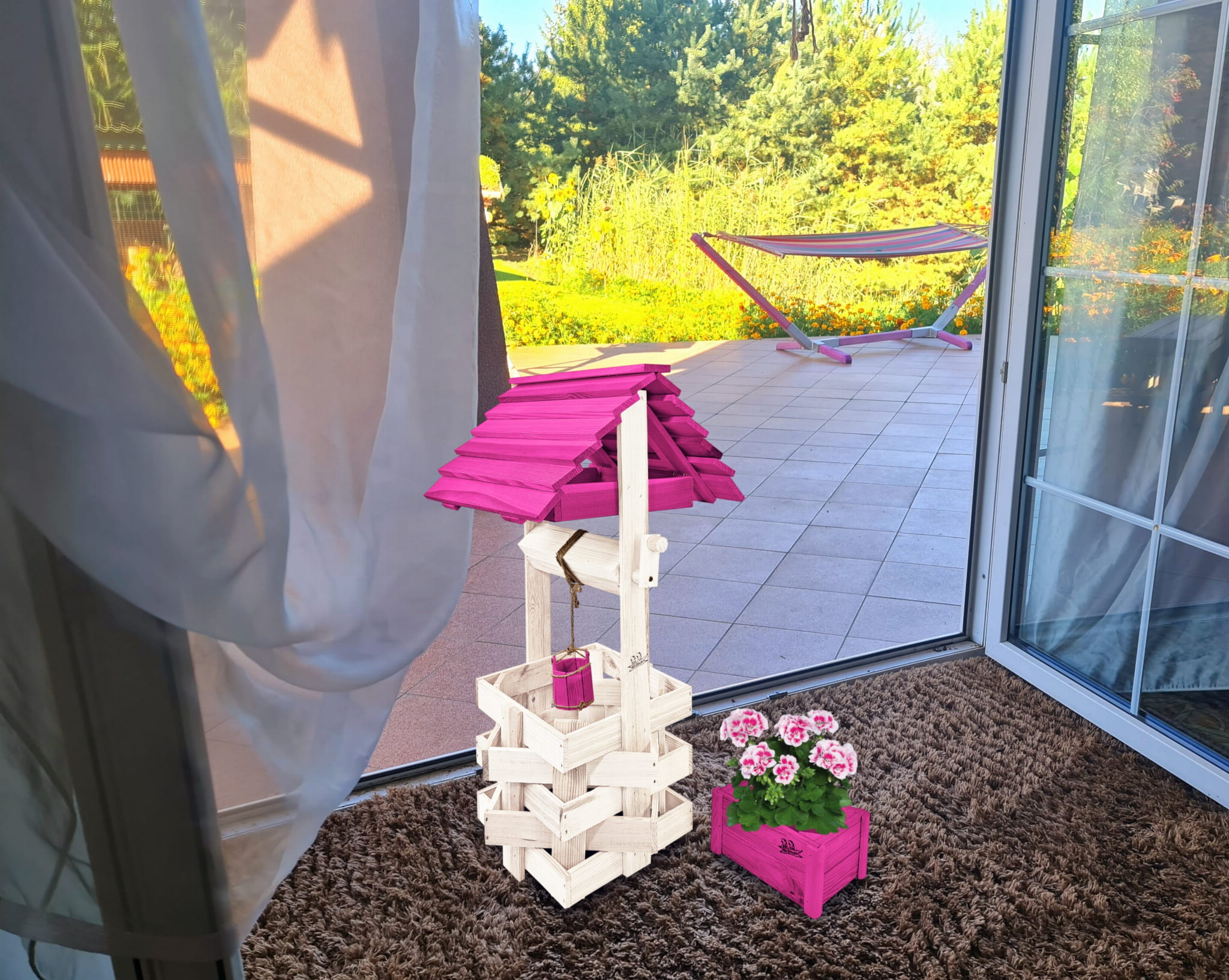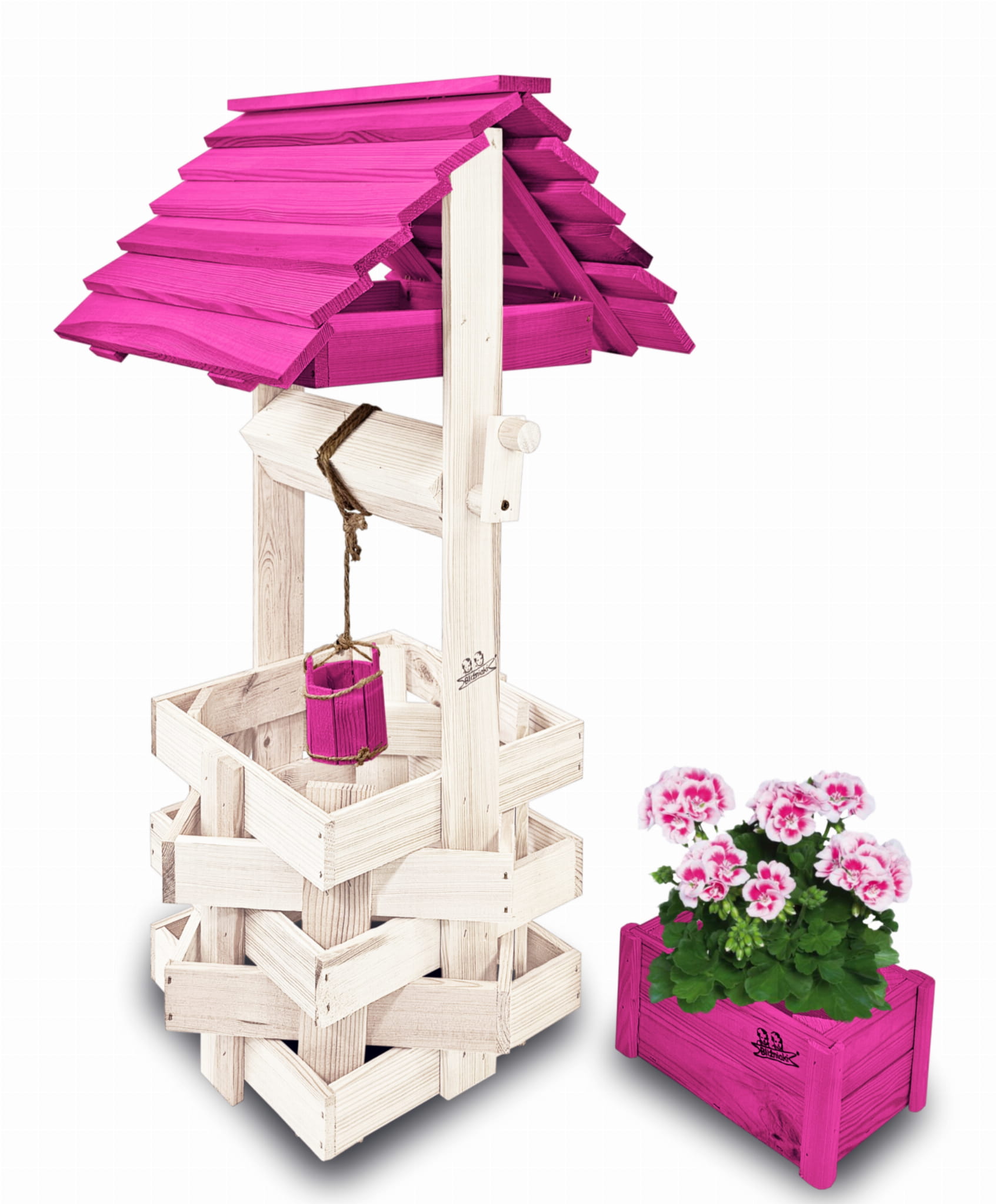 Studzienka na peralgonie Donica na kwiaty do Domu i Ogrodu Studnie Balkonowe Tarasowe Studnia Drewniana Ozdobna ogrodowa Kolor BIAŁY RÓŻOWY Figura Ogrodowa HANDMADE Kwietnik doniczki Prezent Studzienki ozdobne OZDOBA WNĘTRZ I OGRODU SC1 BI RÓ