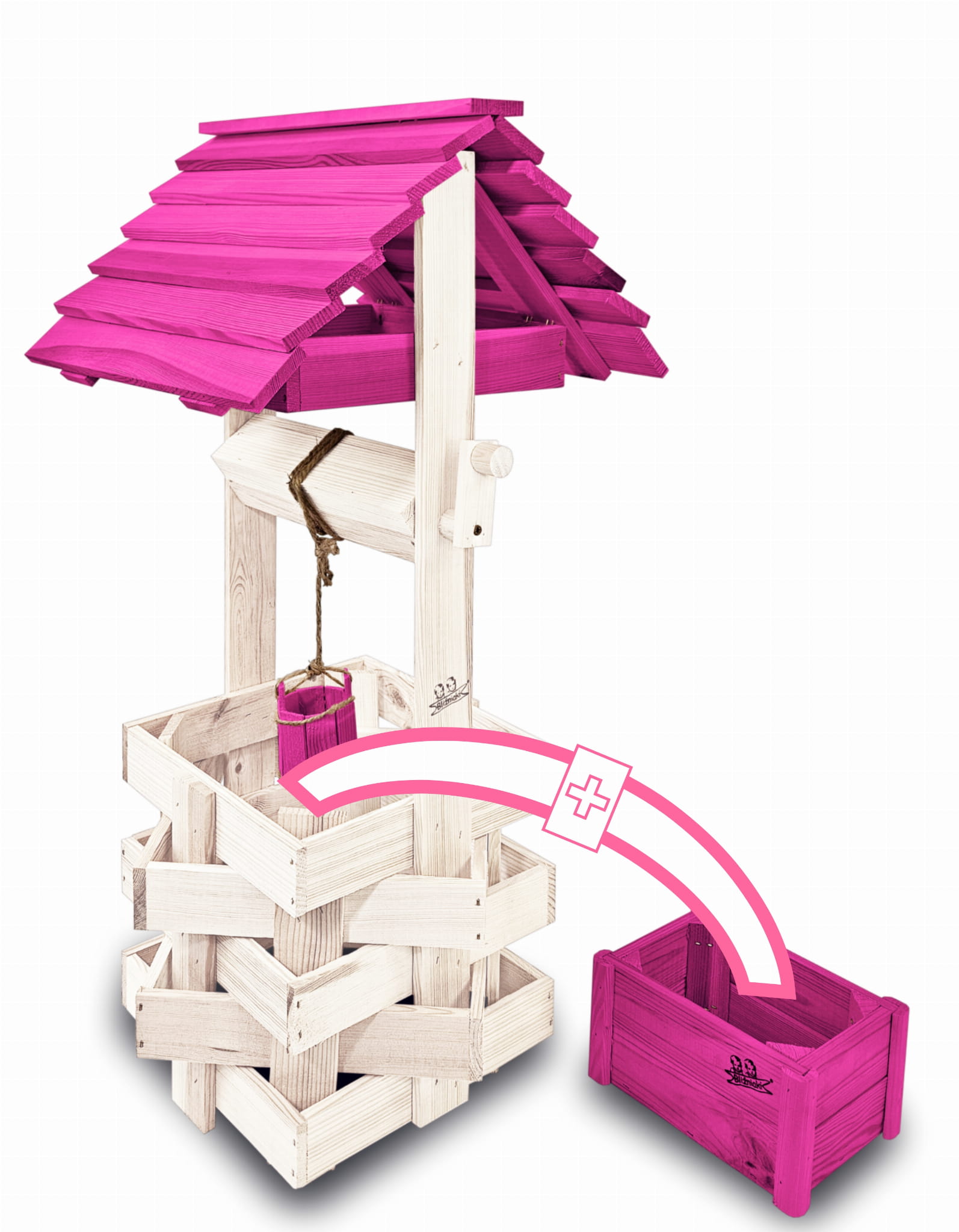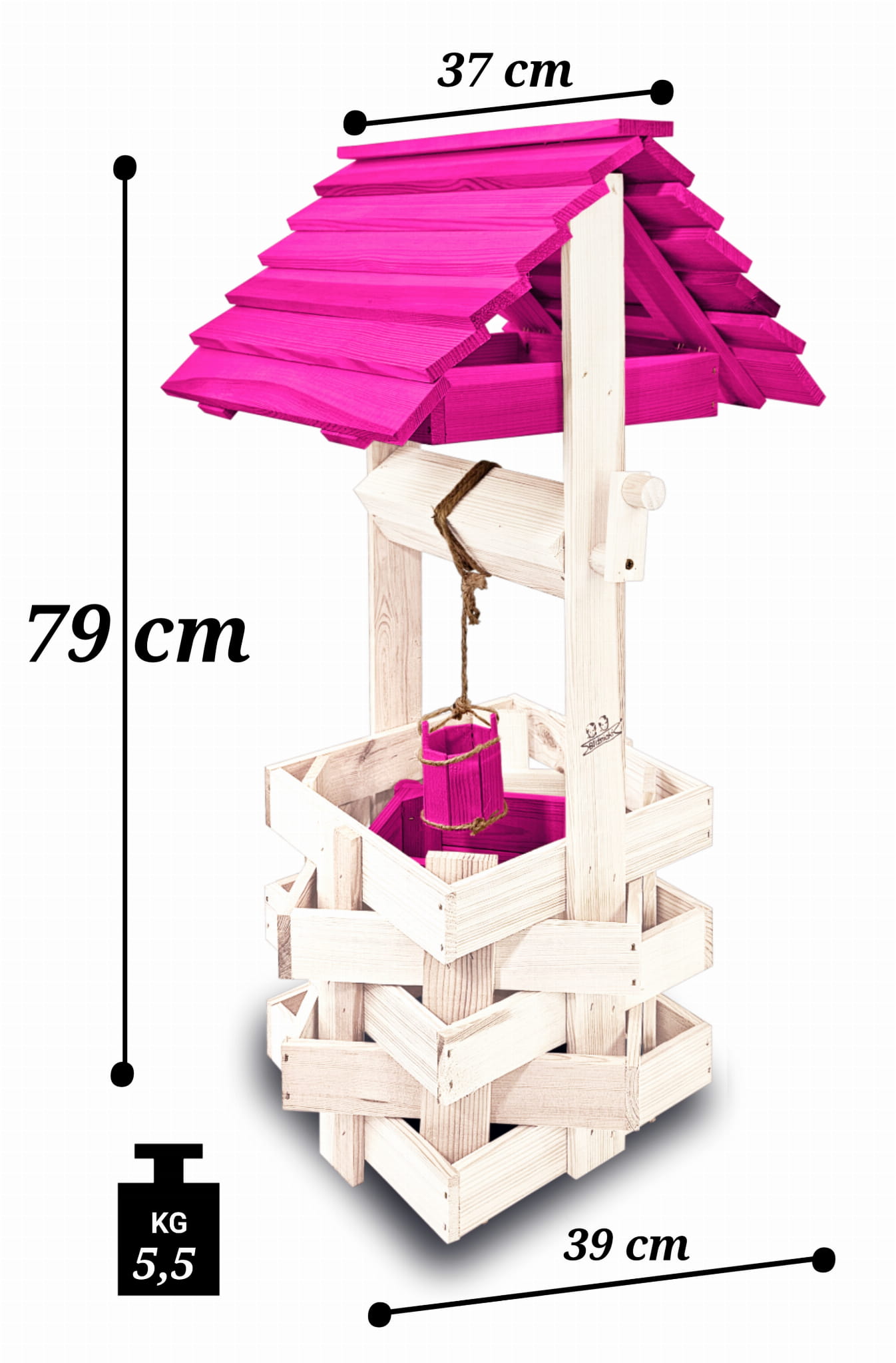 Do studni dołączona jest drewniana doniczka na kwiaty, utrzymana w tej samej estetyce, tworząc spójną i harmonijną całość.