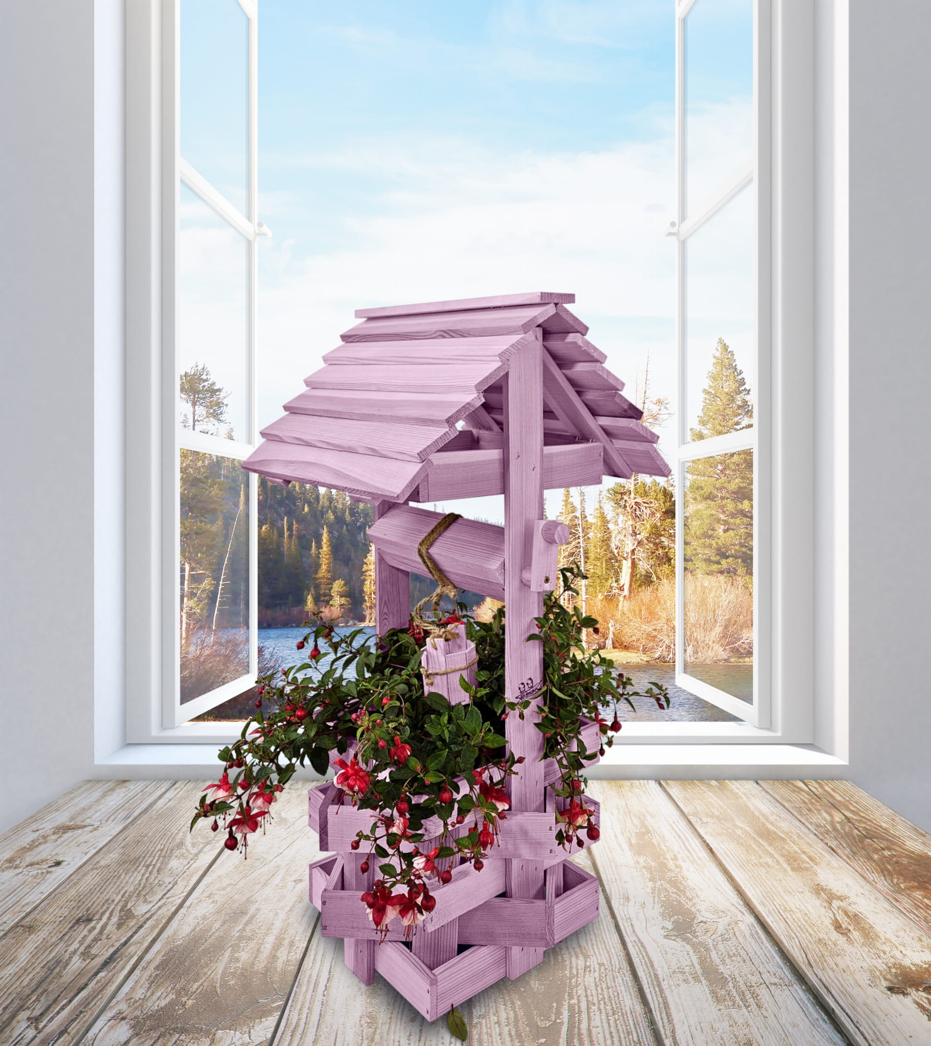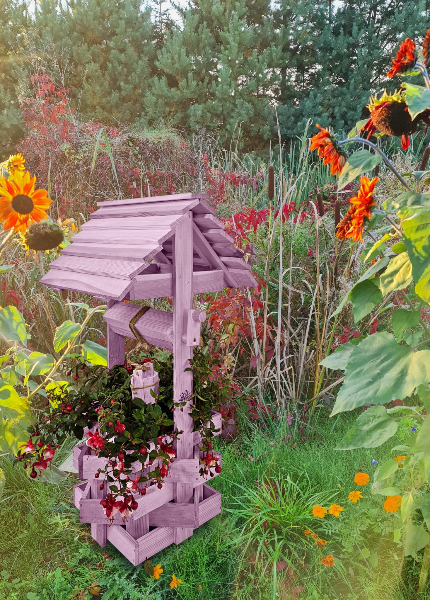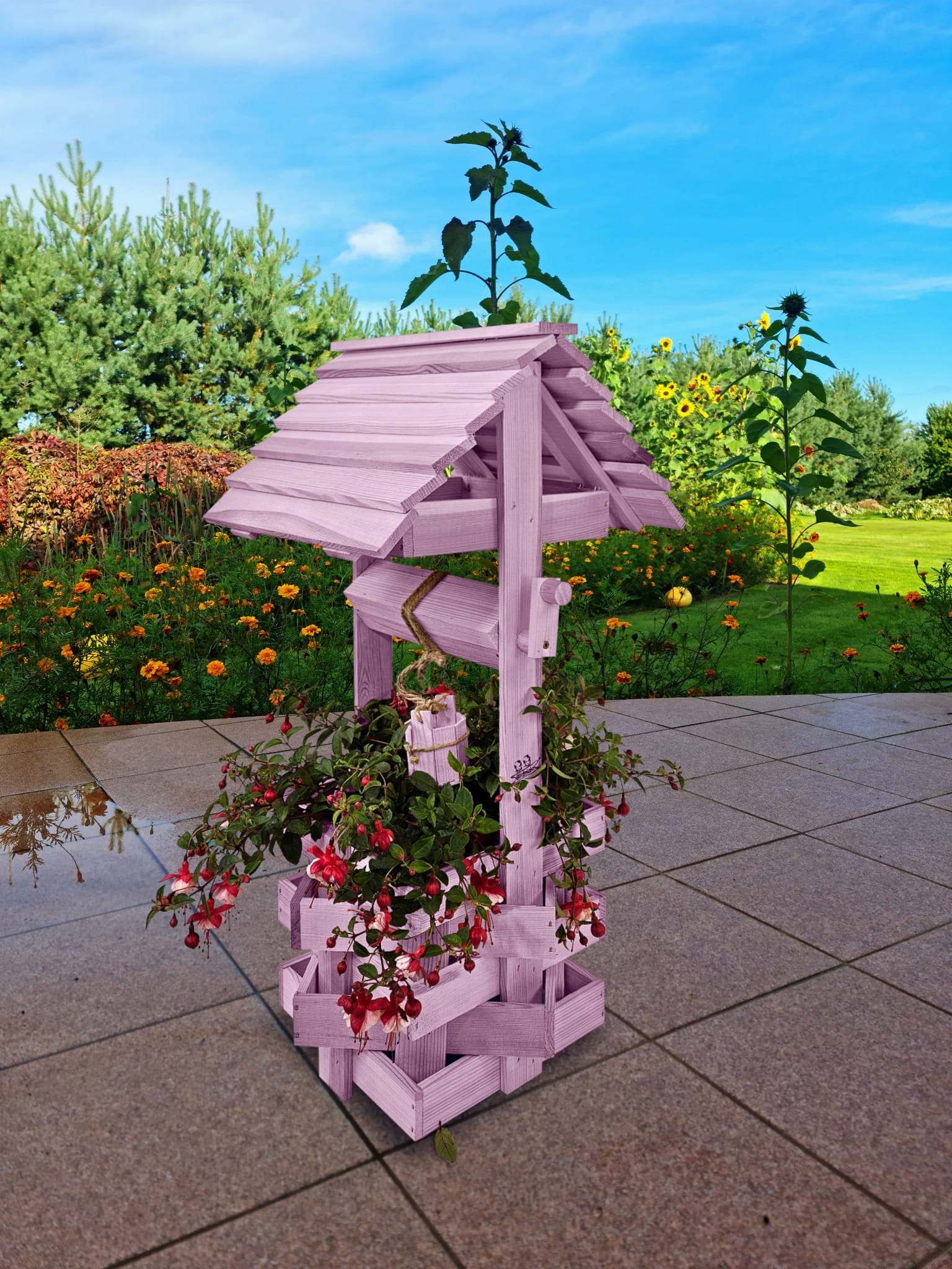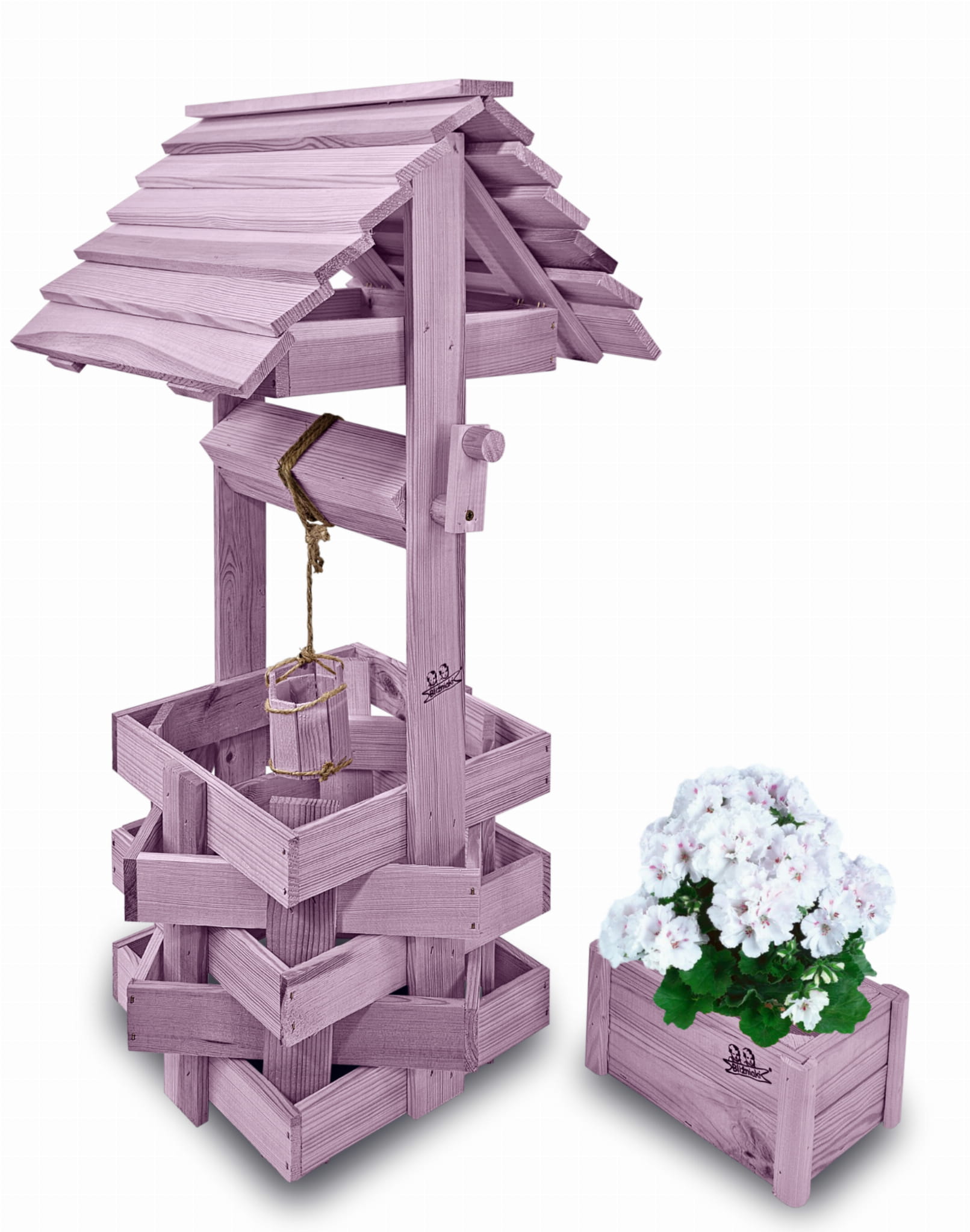 Studzienka na peralgonie Studnia Drewniana Ozdobna ogrodowa Kolor PASTELOWY FIOLETOWY Studnie Balkonowe Tarasowe OZDOBA WNĘTRZ I OGRODU RENKODZIEŁO Figura Ogrodowa Donica na kwiaty do Domu i Ogrodu Kwietnik doniczki Prezent Studzienki ozdobne SC1 FNP