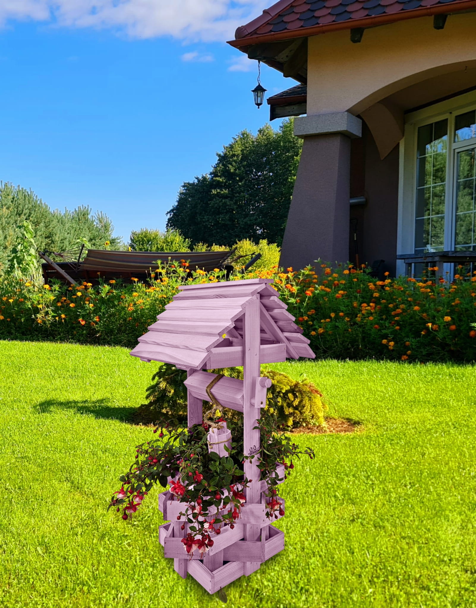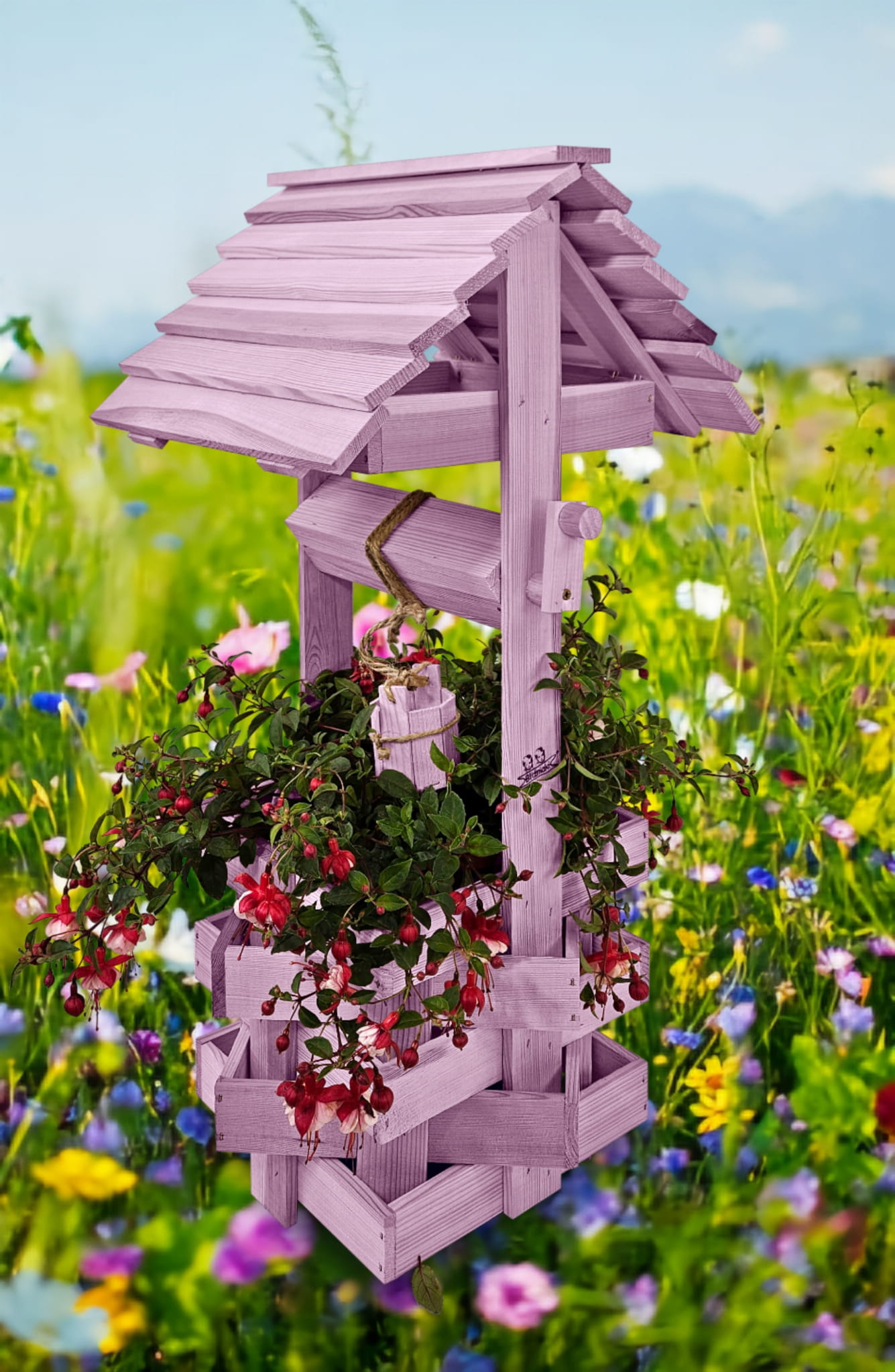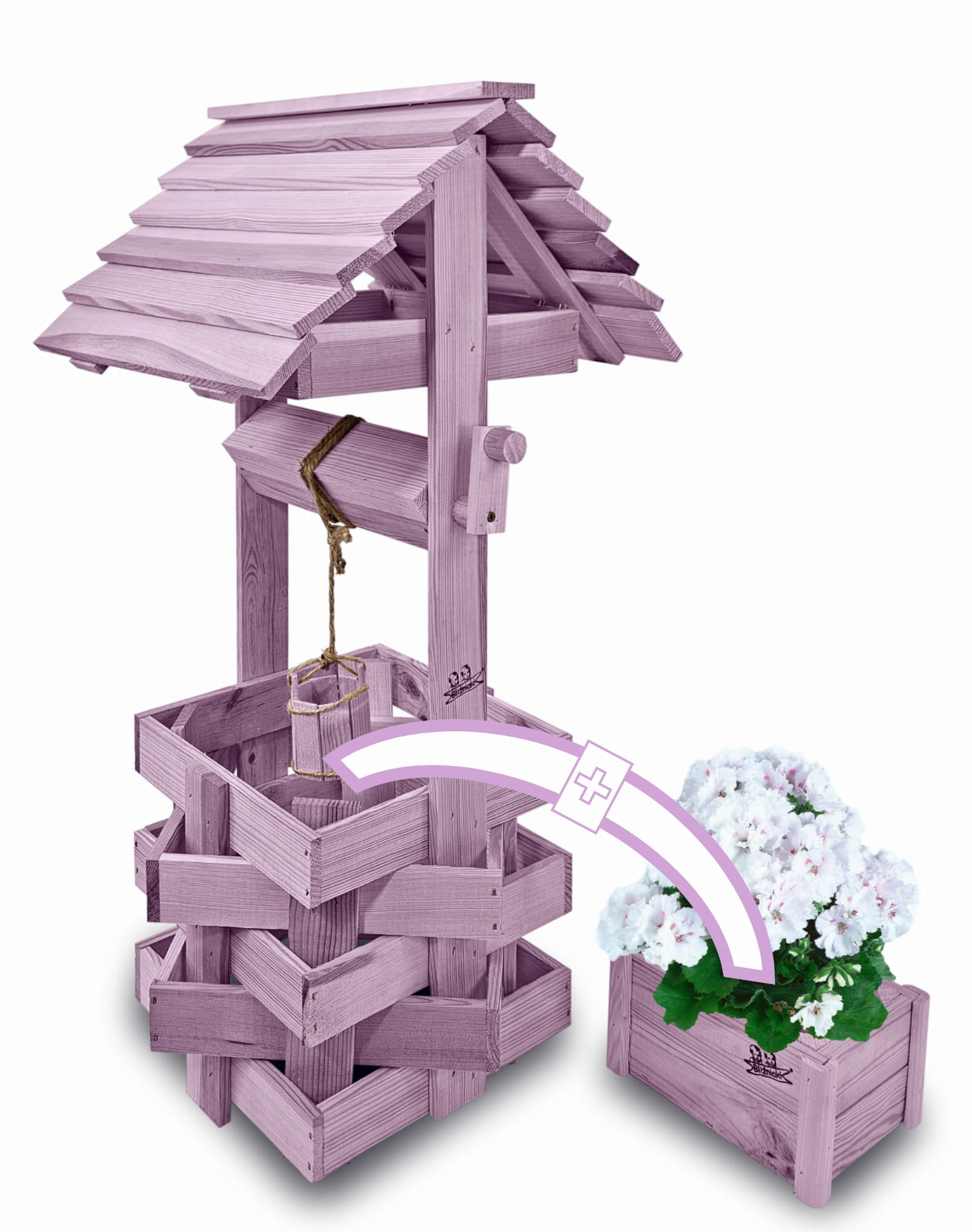 Studzienka na peralgonie Studnia Drewniana Ozdobna ogrodowa Kolor PASTELOWY FIOLETOWY Studnie Balkonowe Tarasowe OZDOBA WNĘTRZ I OGRODU RENKODZIEŁO Figura Ogrodowa Donica na kwiaty do Domu i Ogrodu Kwietnik doniczki Prezent Studzienki ozdobne SC1 FNP