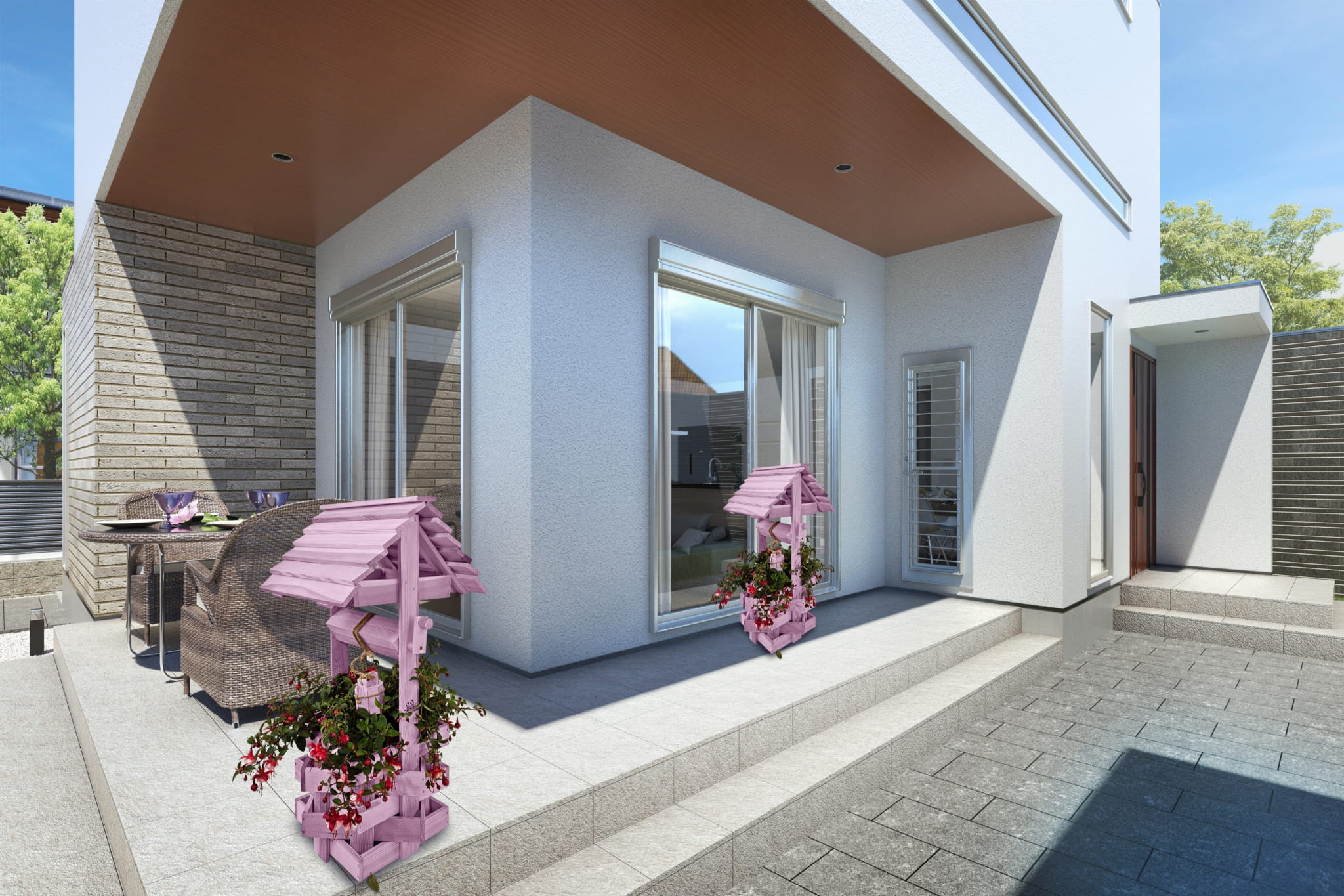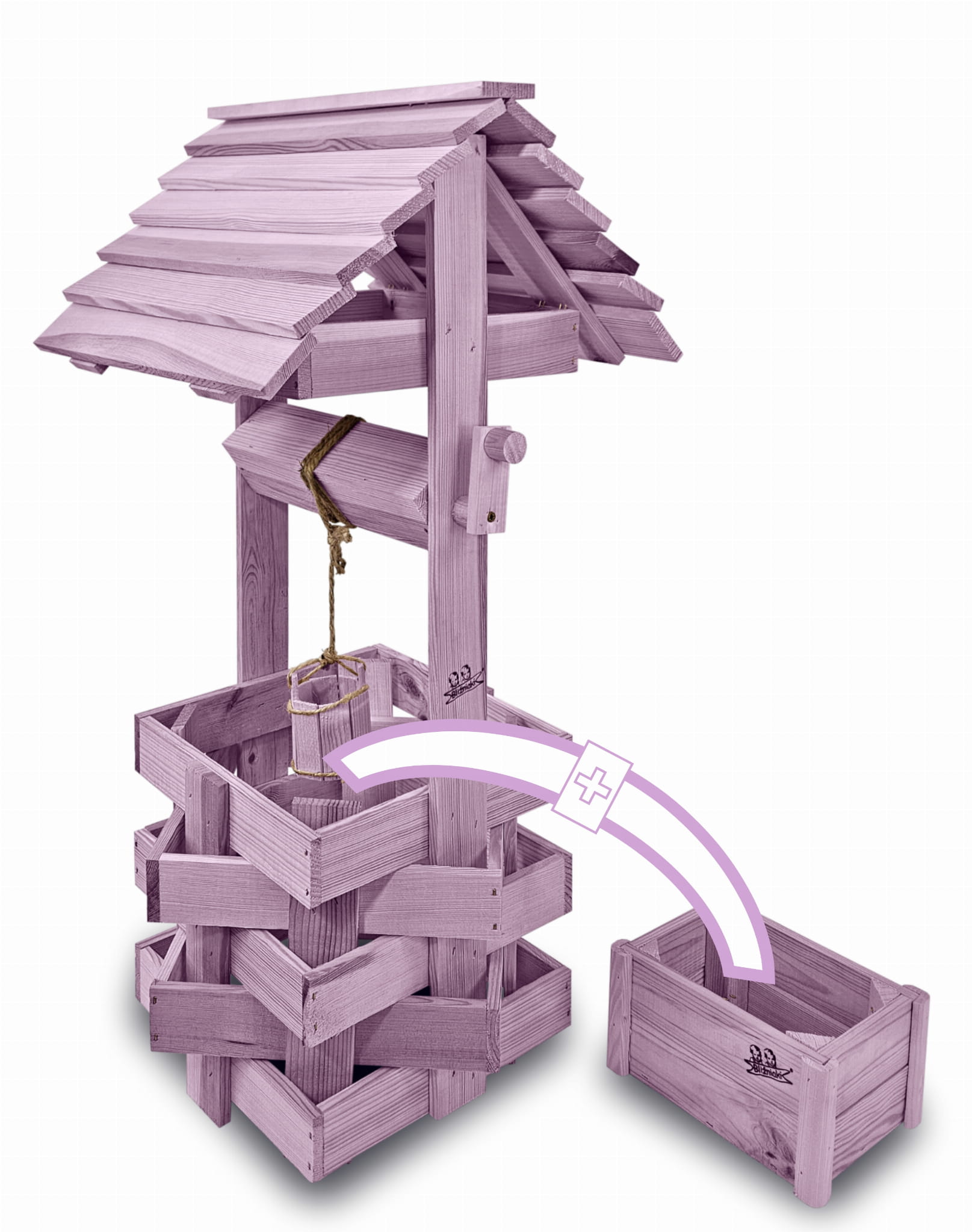 Do studni dołączona jest drewniana doniczka na kwiaty, utrzymana w tej samej estetyce, tworząc spójną i harmonijną całość.