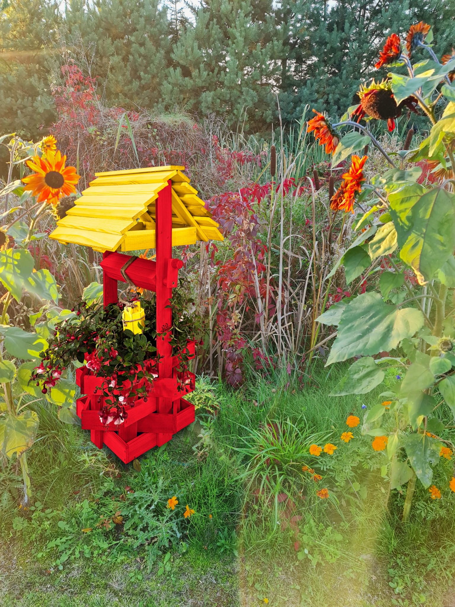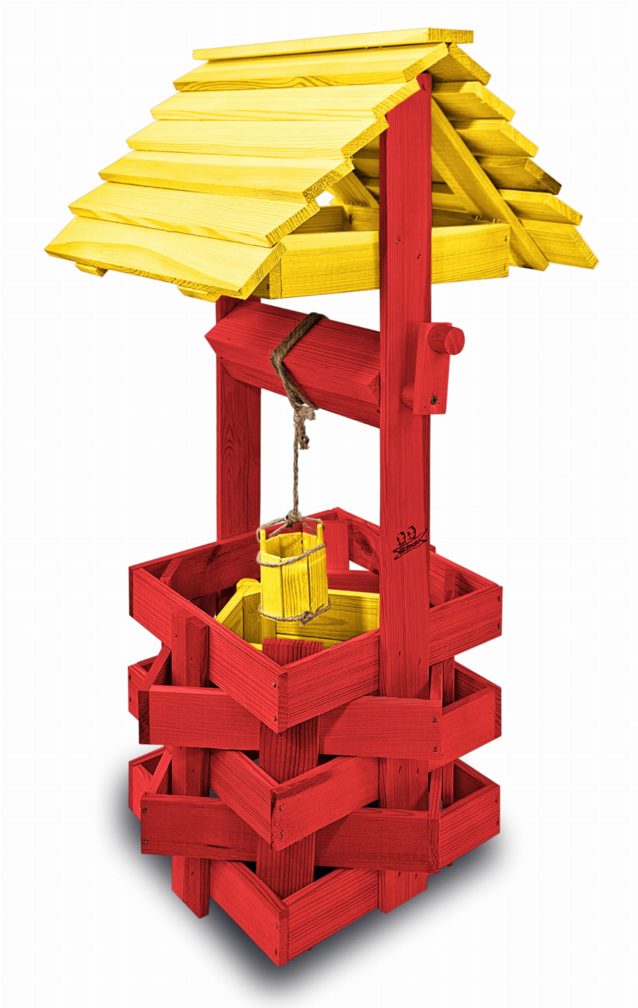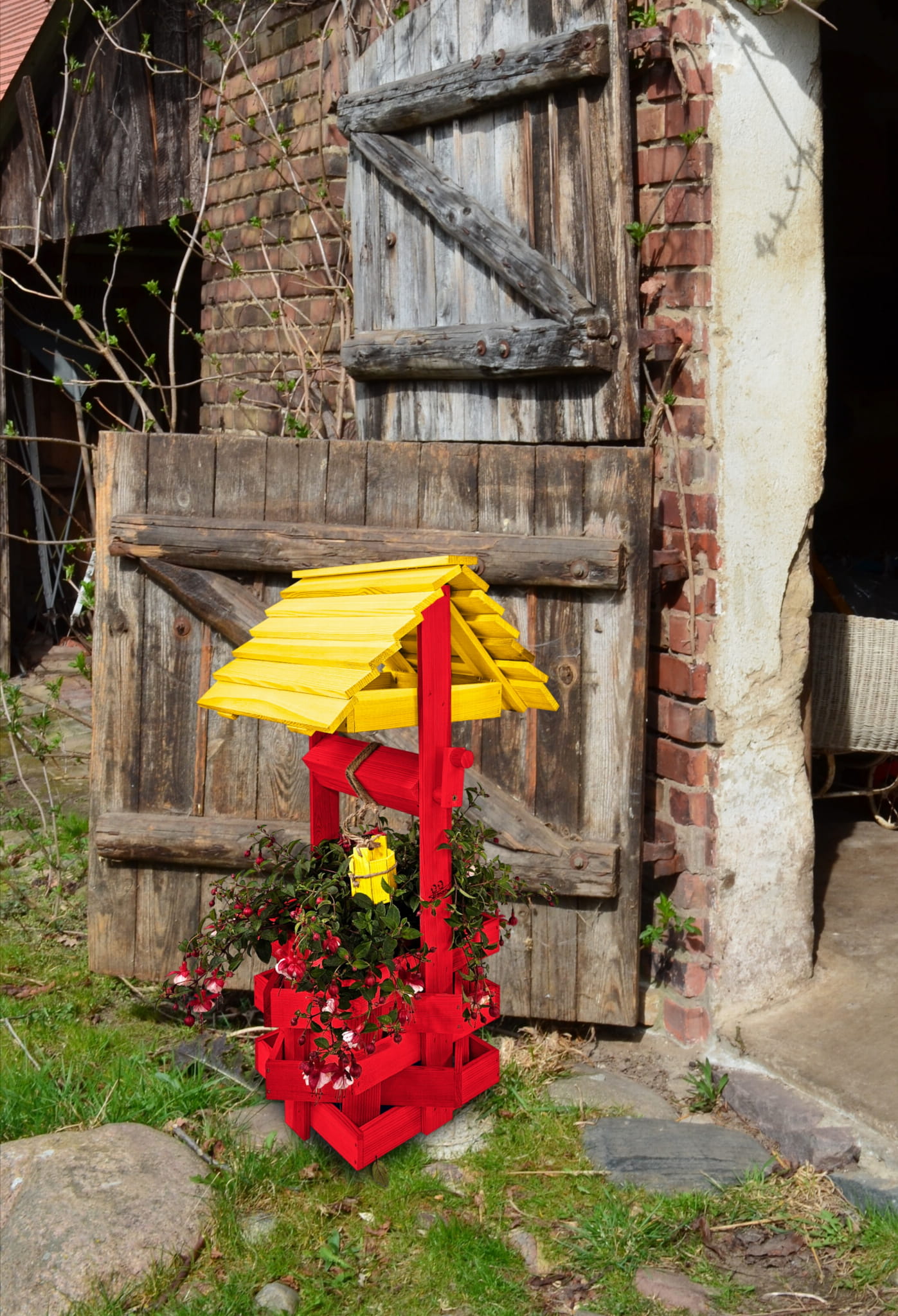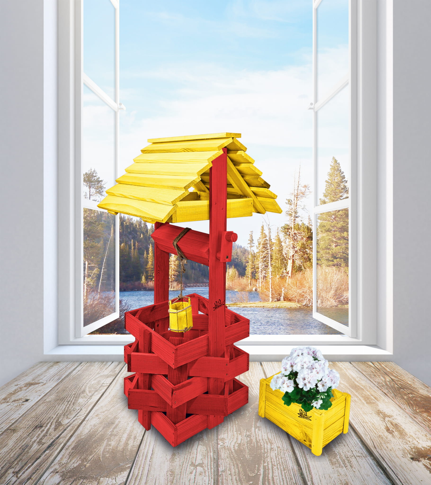 Studzienka ozdobna drewniana Kolor ŻÓŁTO CZERWONY Studnie Balkonowe Tarasowe Studzienka na peralgonie OZDOBA WNĘTRZ I OGRODU Figura Ogrodowa Kwietnik doniczki Prezent Donica na kwiaty do Domu i Ogrodu SC1 CB ZB