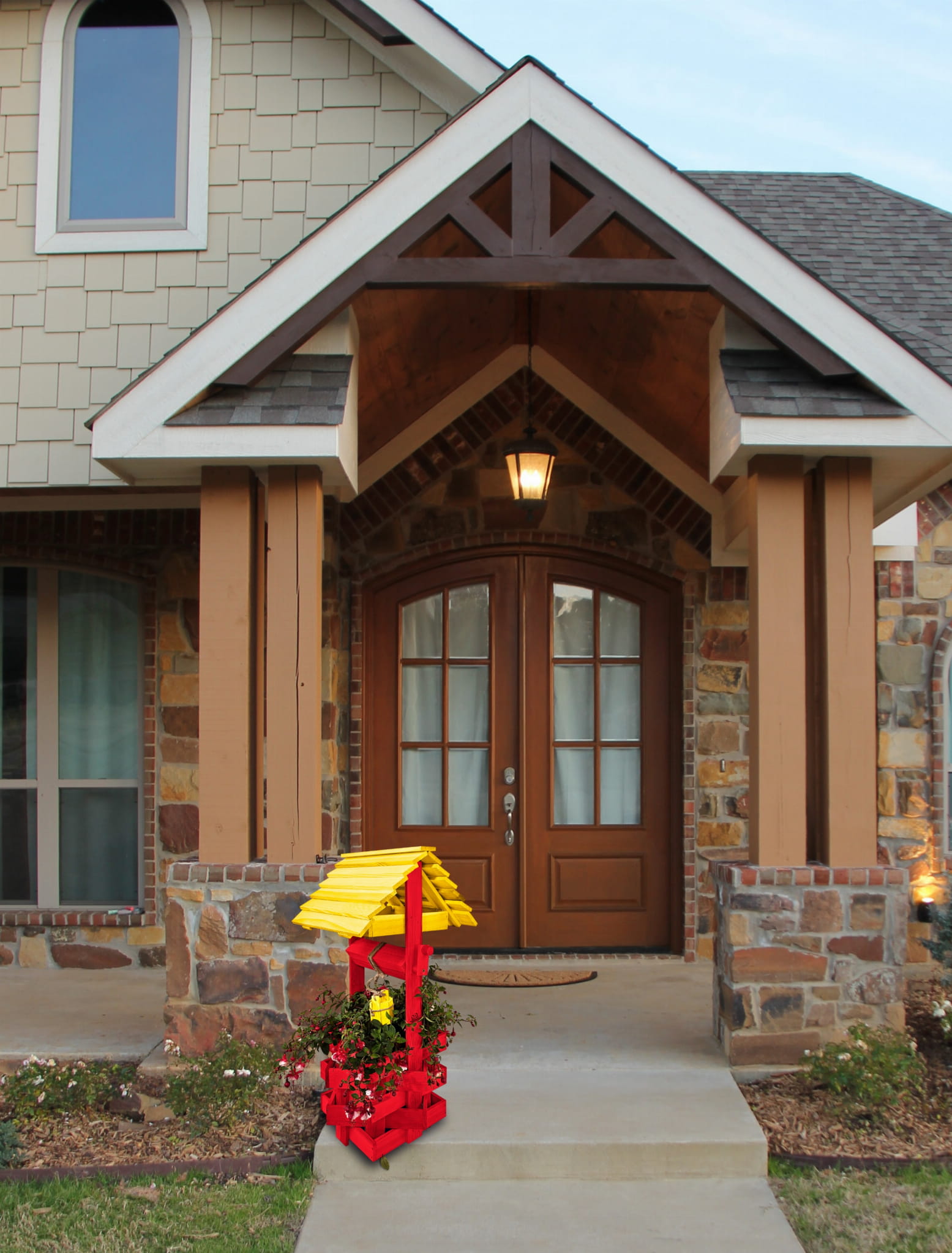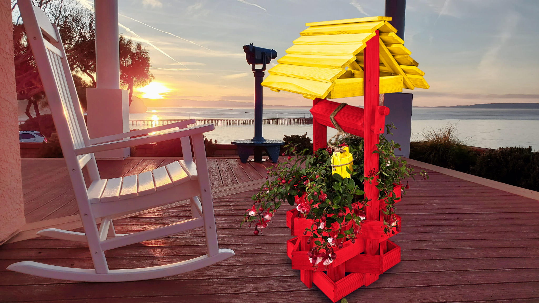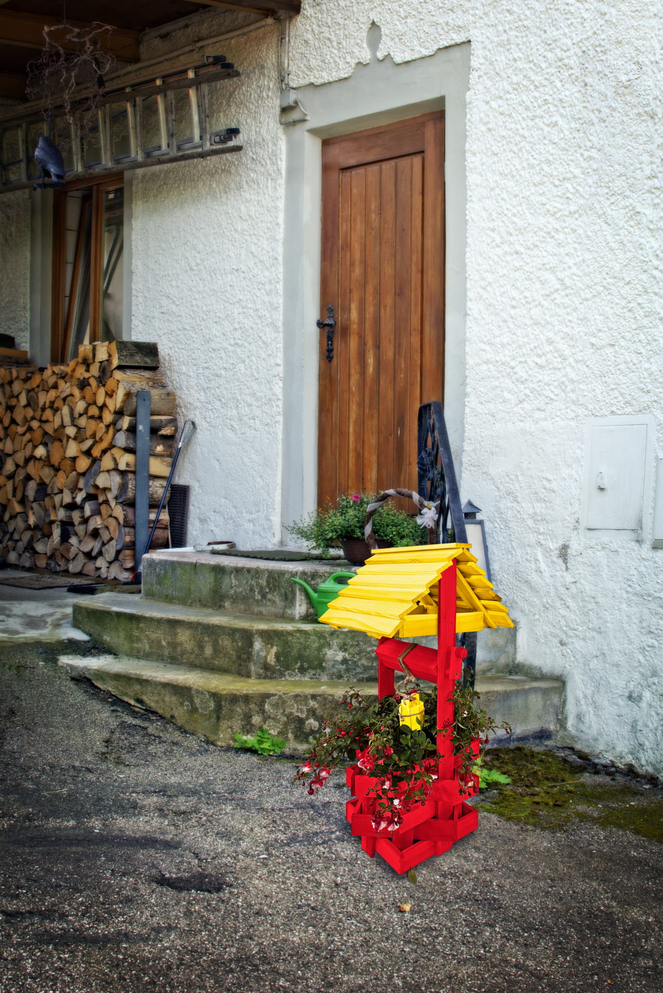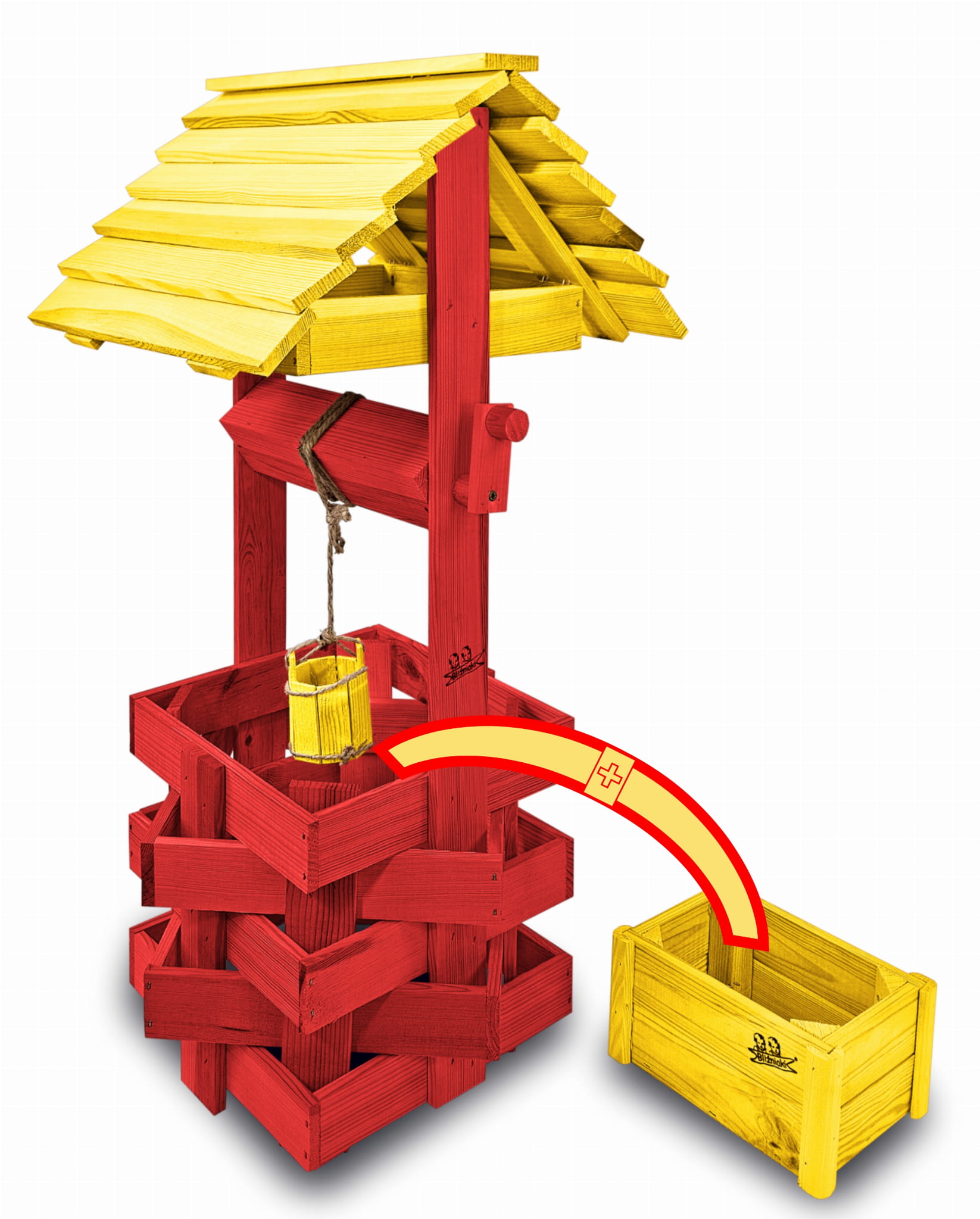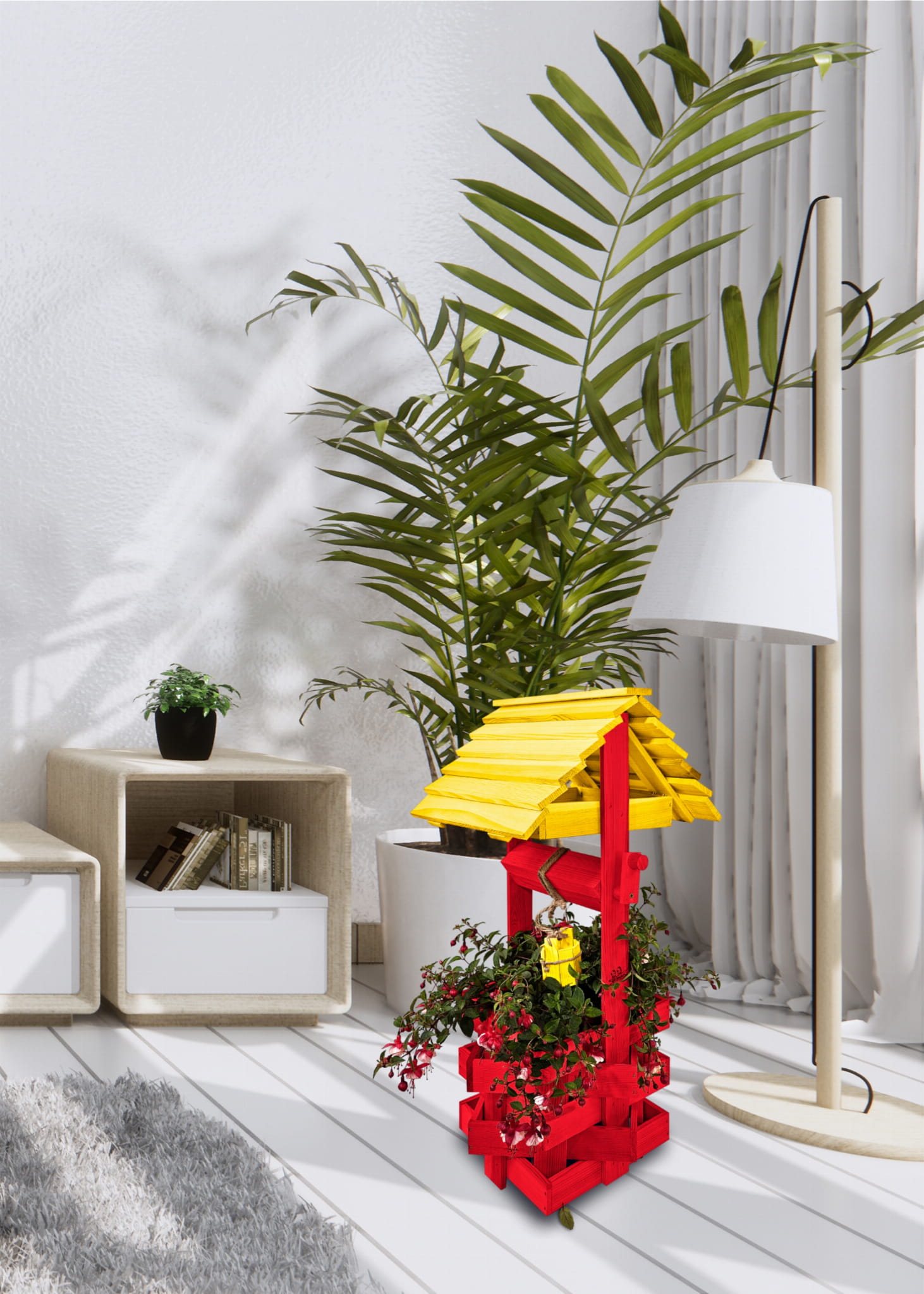 Studzienka ozdobna drewniana Kolor ŻÓŁTO CZERWONY Studnie Balkonowe Tarasowe Studzienka na peralgonie OZDOBA WNĘTRZ I OGRODU Figura Ogrodowa Kwietnik doniczki Prezent Donica na kwiaty do Domu i Ogrodu SC1 CB ZB