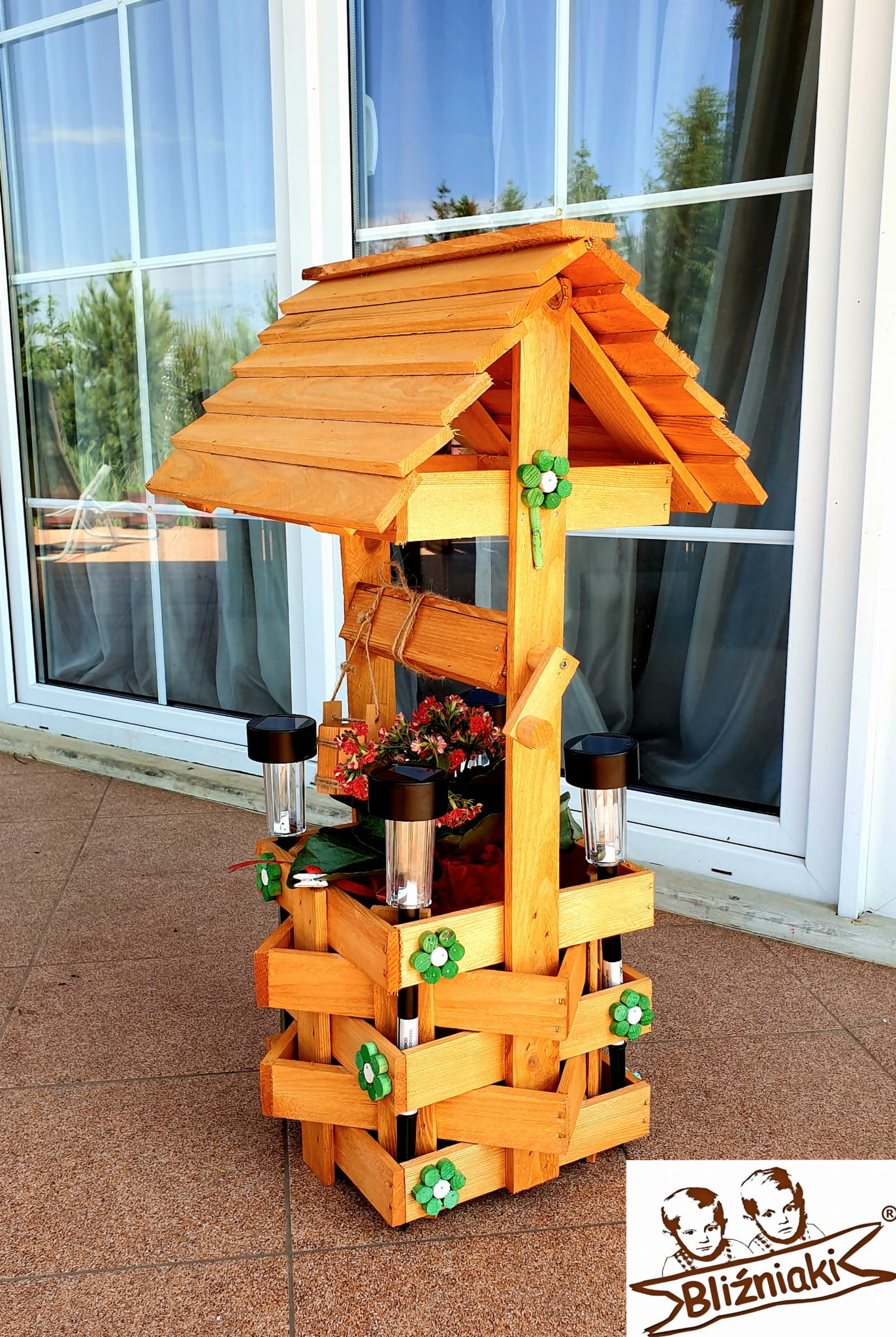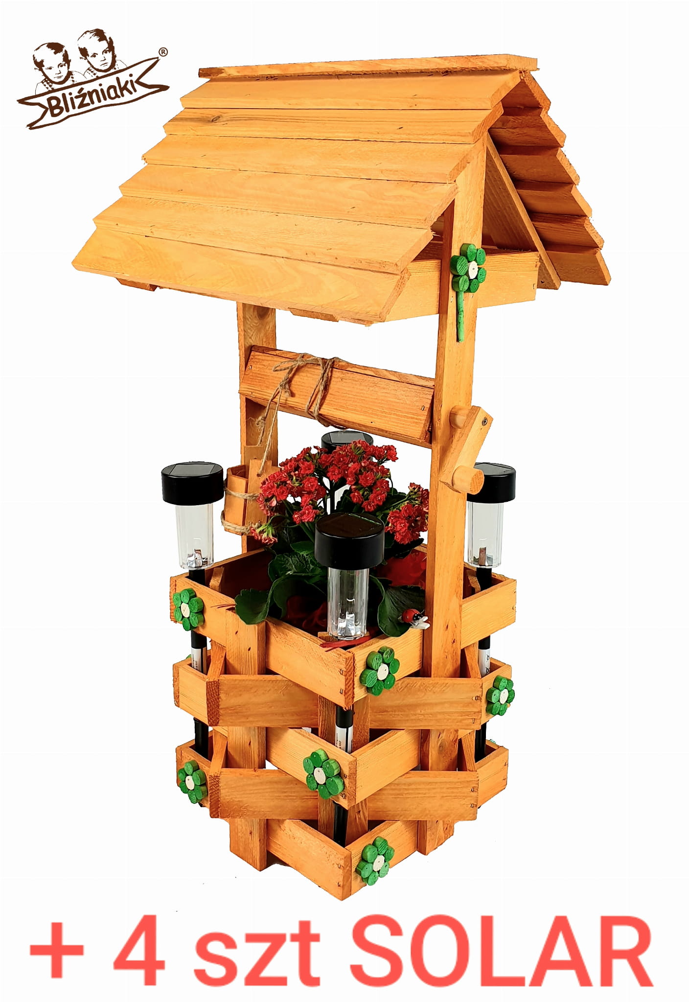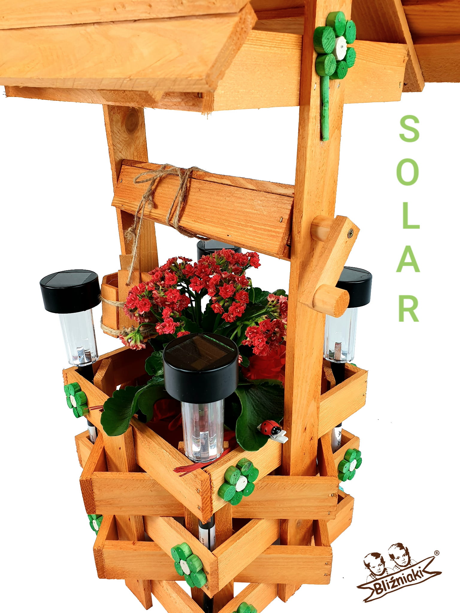 Stylowa Studnia Ogrodowa Ozdobny Kwietnik z Lampami Solarnymi Stojak z Drewna ze Skrzynką na Kwiaty i 4 Solarami (SC1 B O SOLAR)