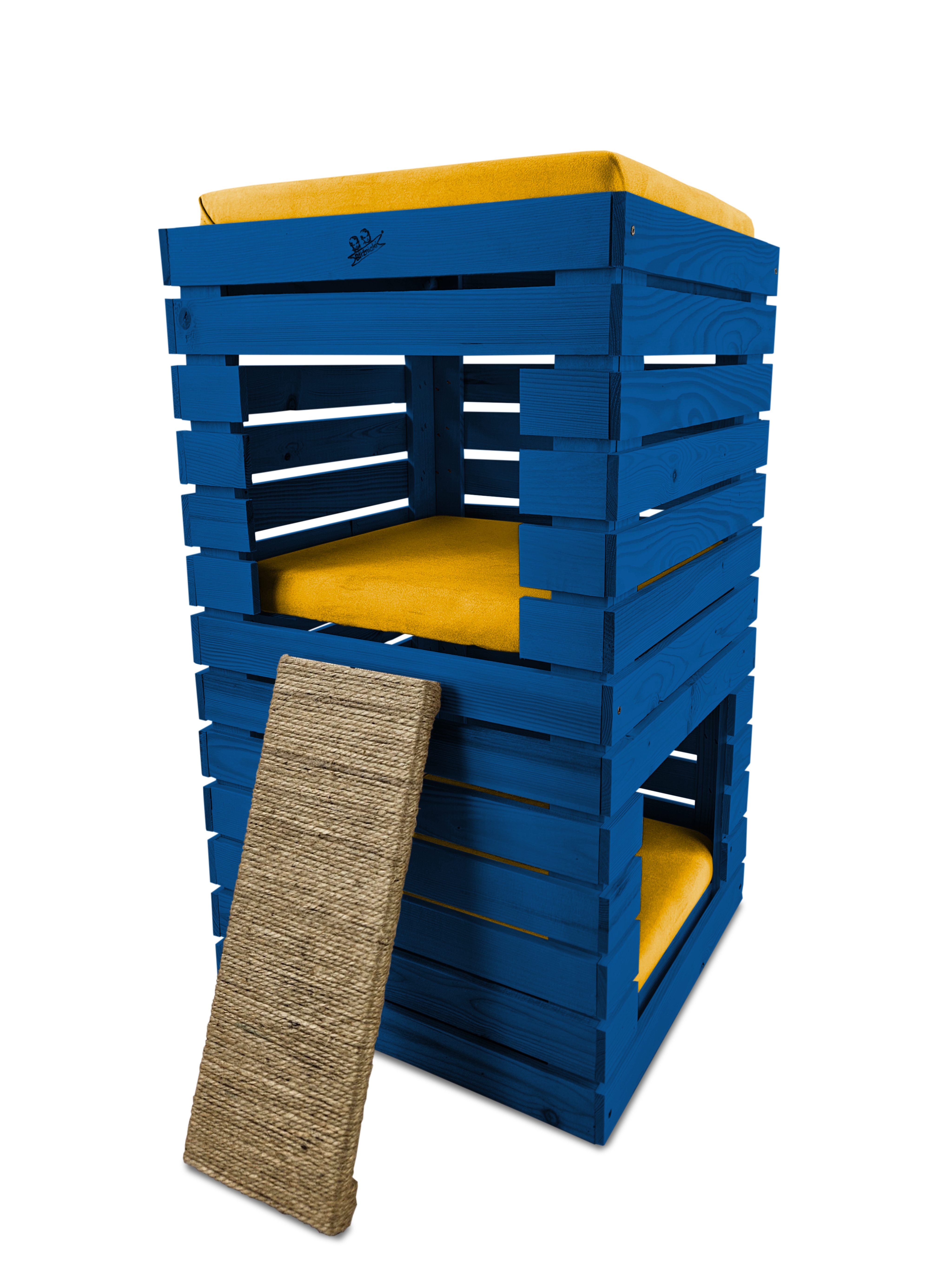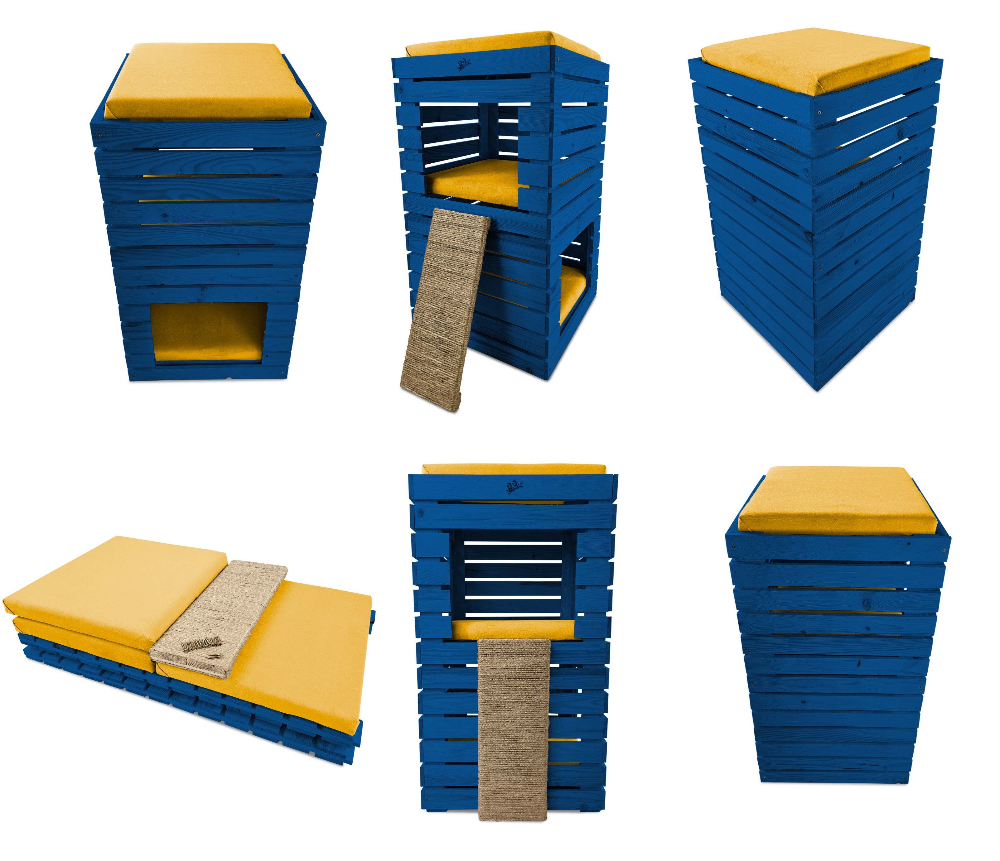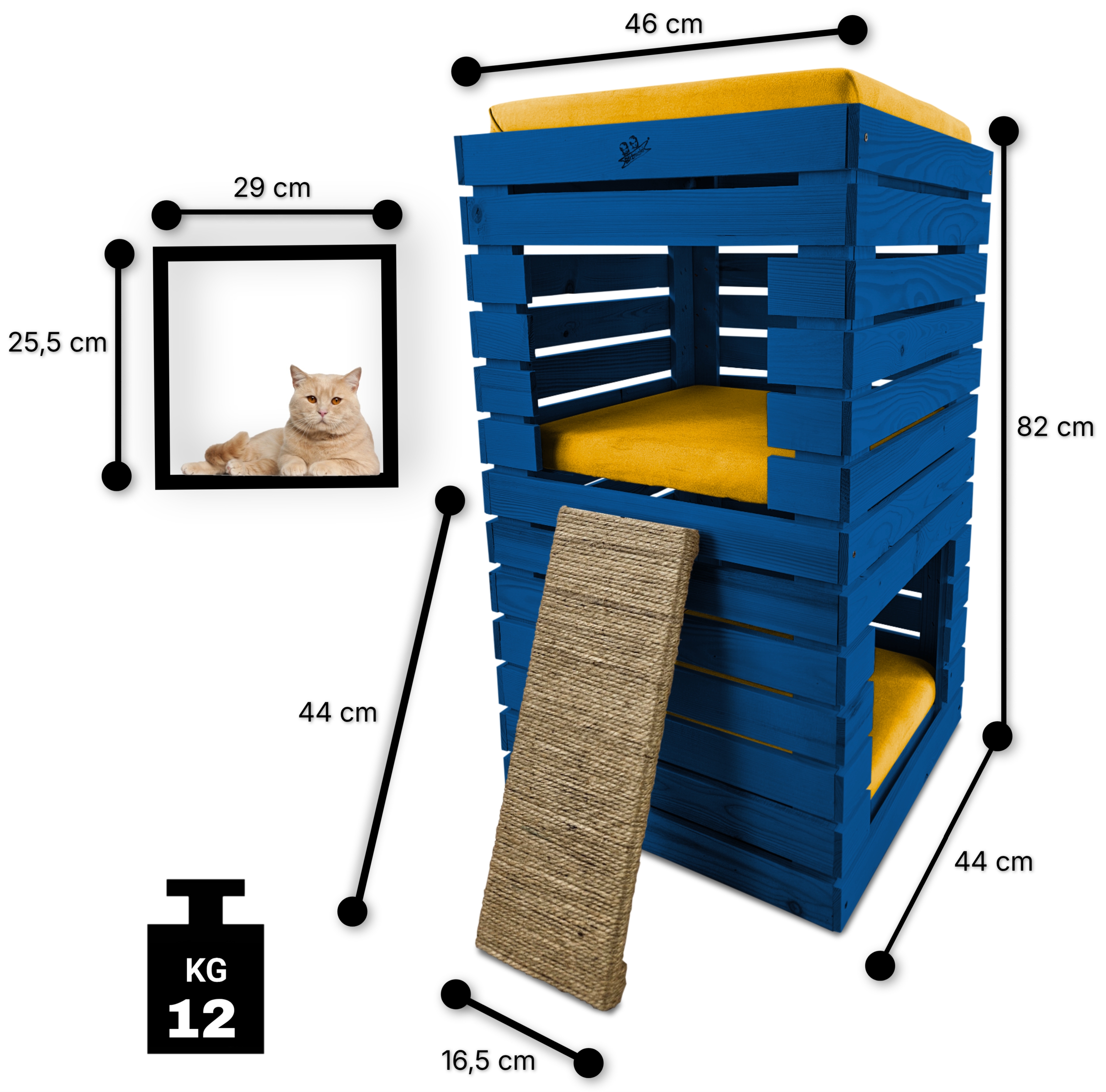 Budka, wykonana w całości z drewna, zachwyca swoją estetyką i naturalnością. Kolor NIEBIESKI harmonijnie współgra z posłaniem w kolorze ŻÓŁTYM, tworząc kompozycję, która pasuje zarówno do wnętrza mieszkania, jak i ogrodu.