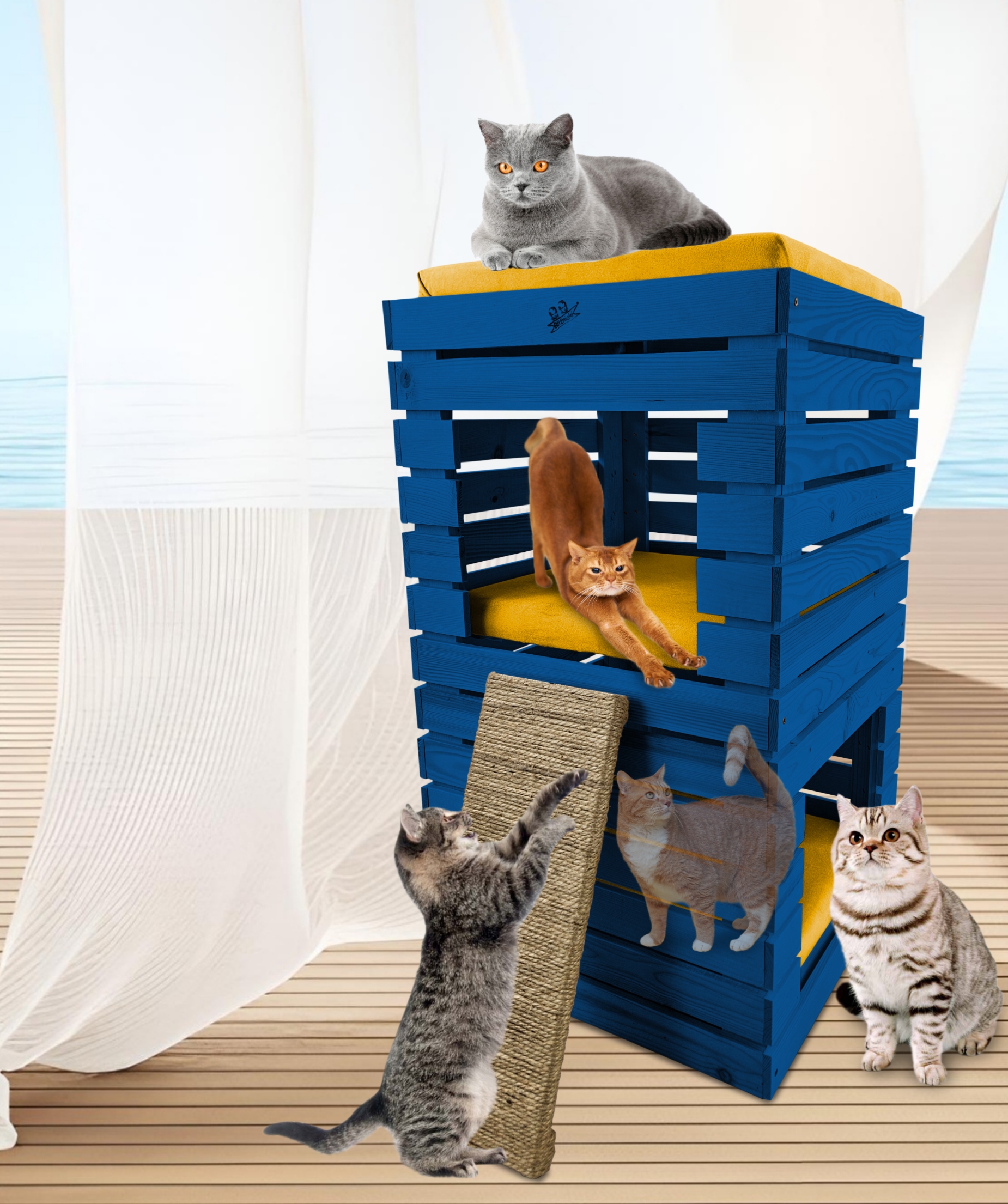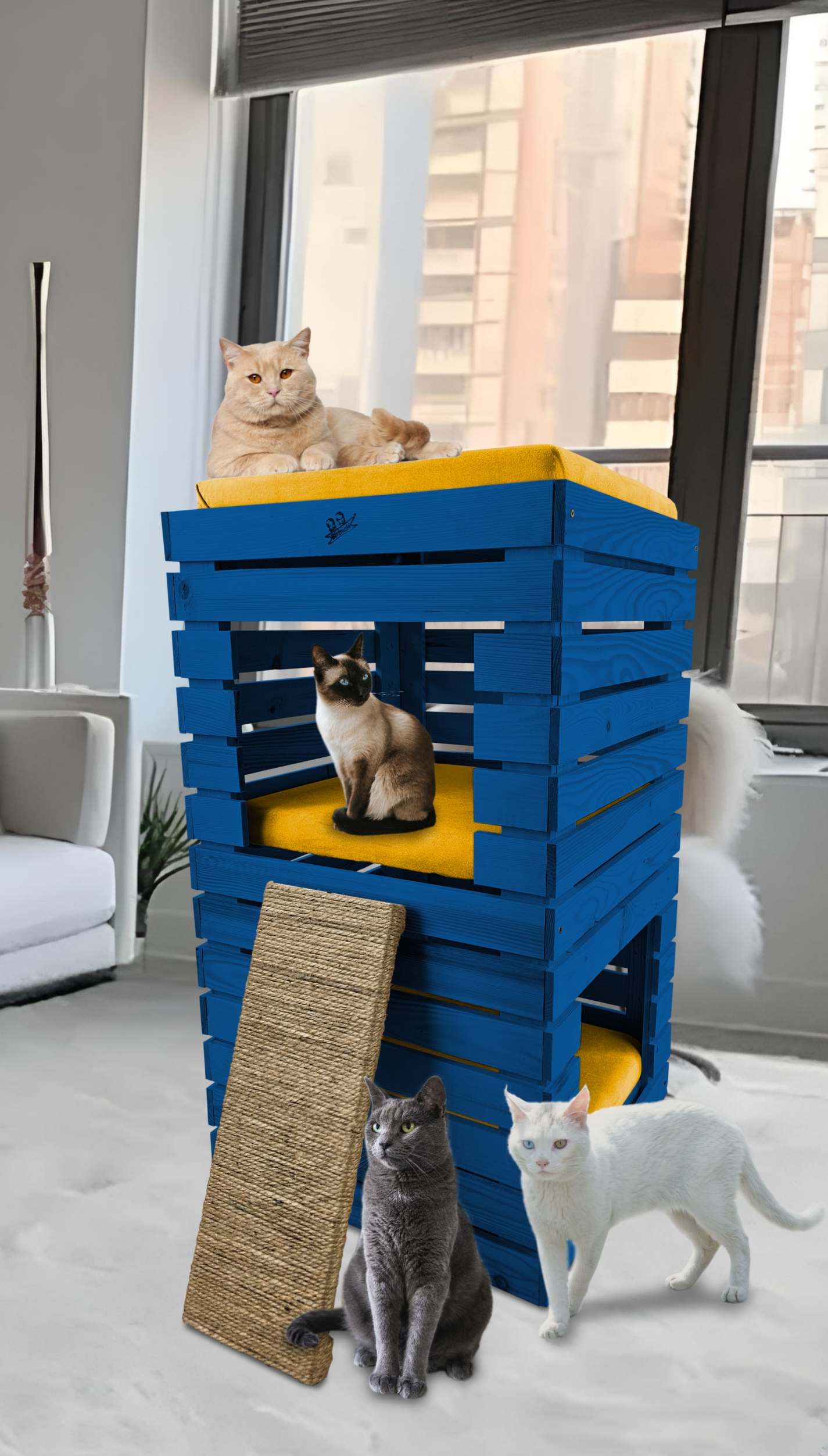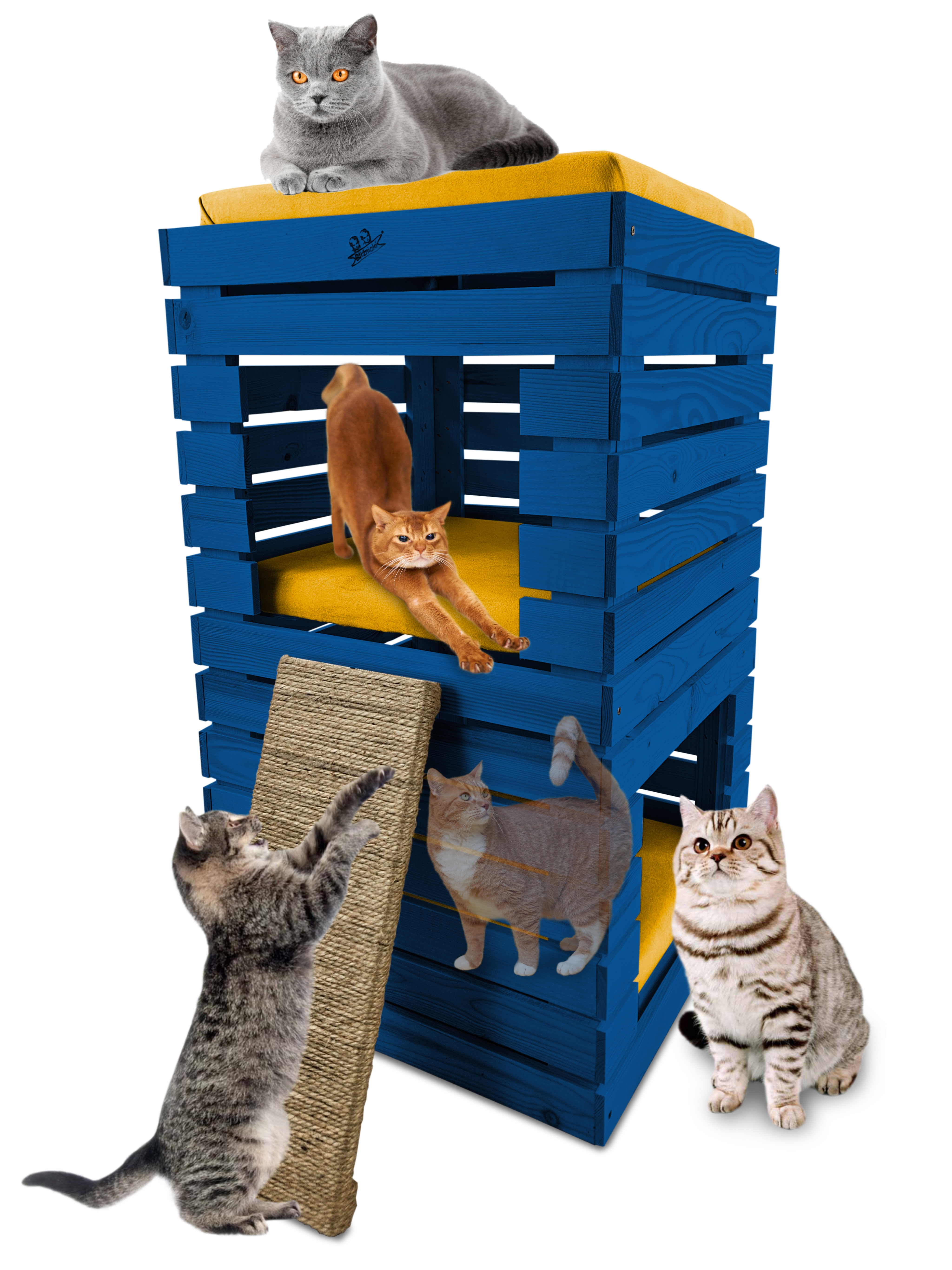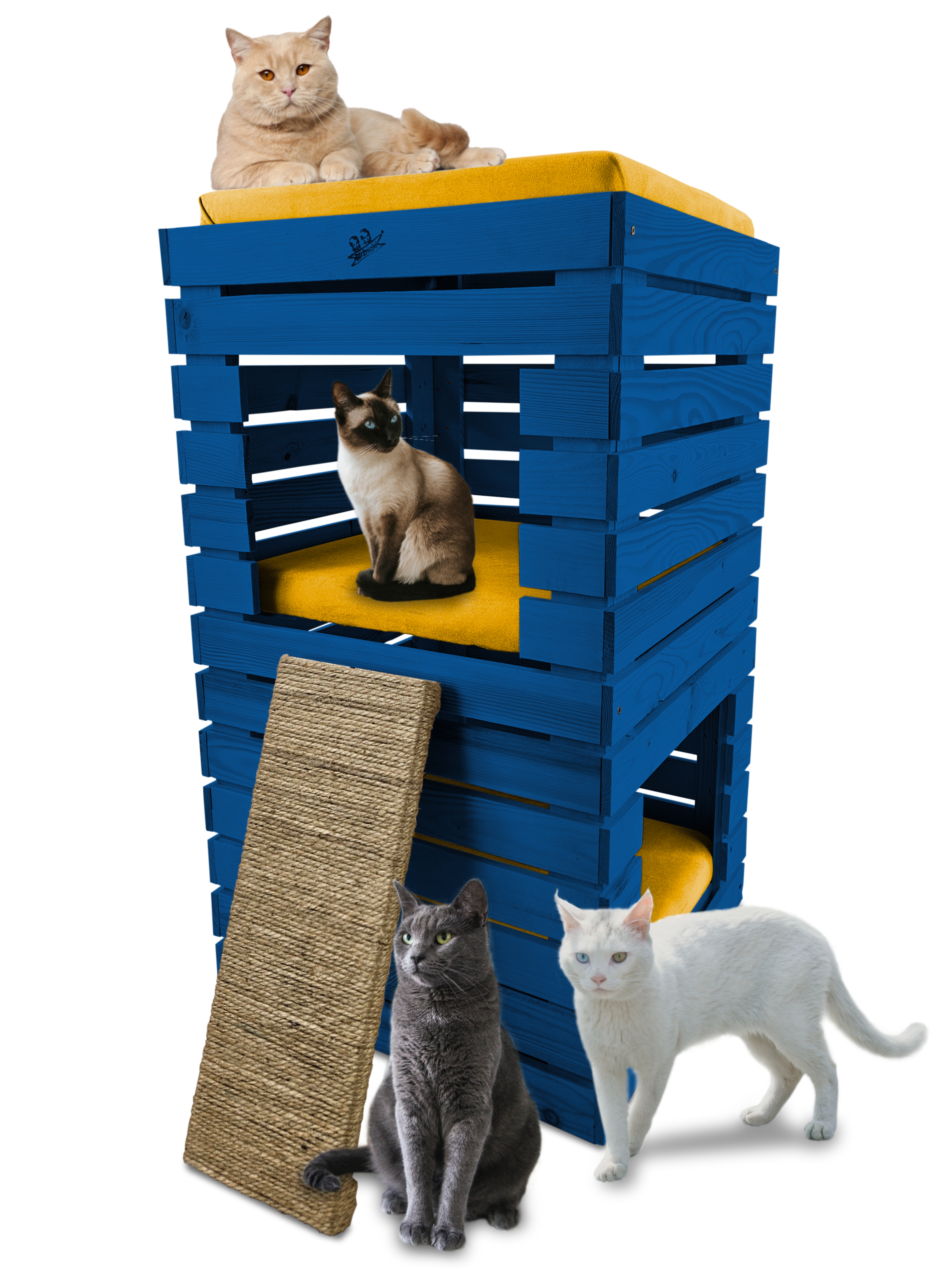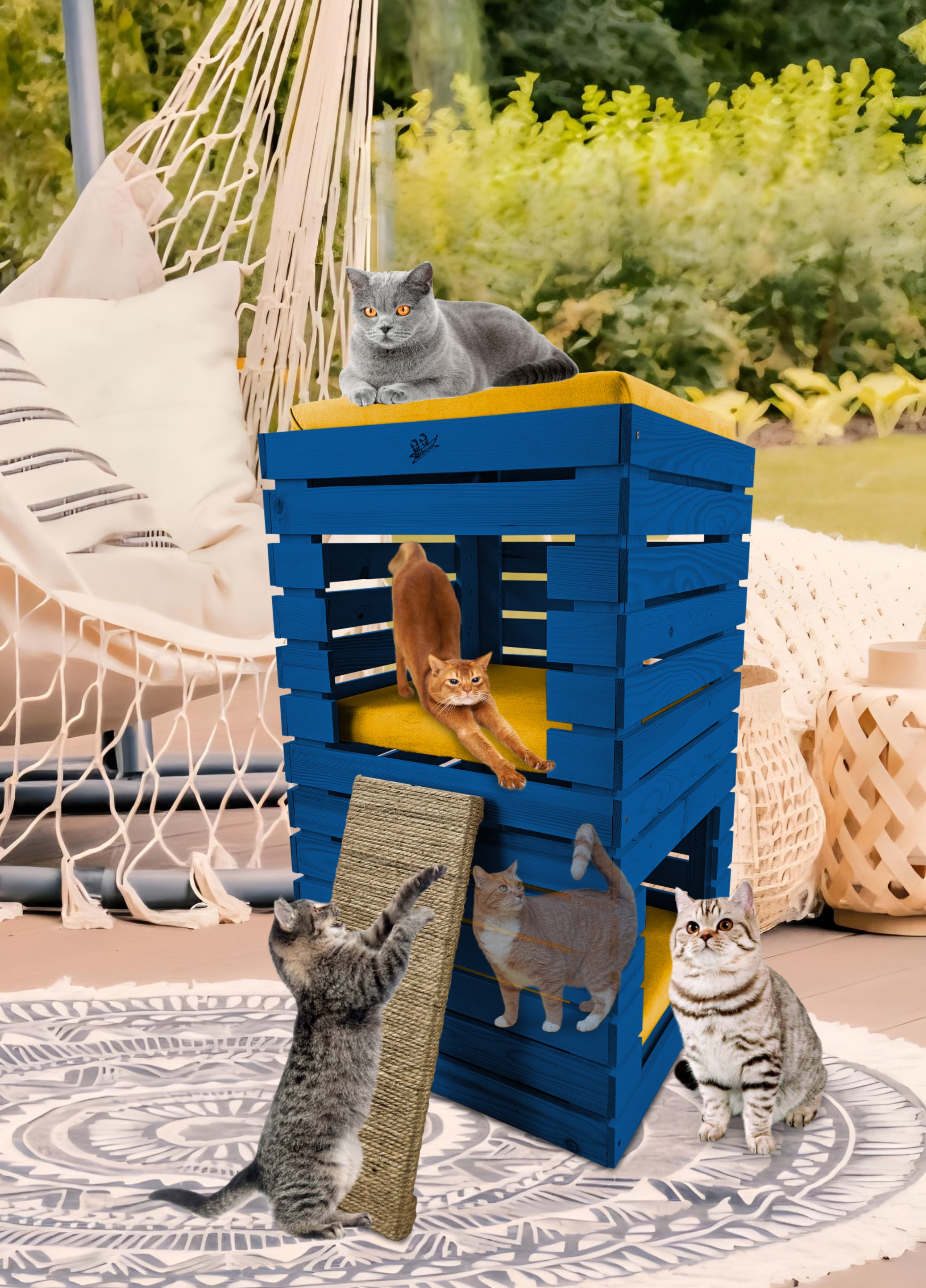 Trzy niezależne legowiska to rozwiązanie, które gwarantuje każdemu kotu prywatność i wygodę. Konstrukcja domku pozwala na przebywanie w nim kilku kotów na trzech poziomach.