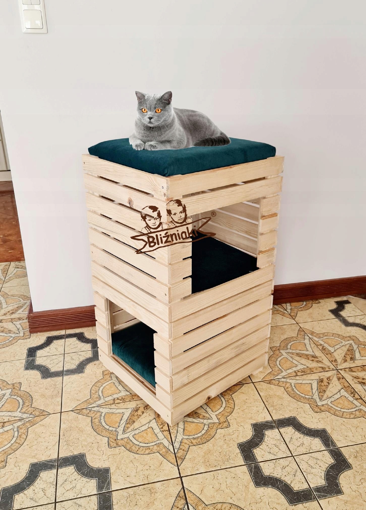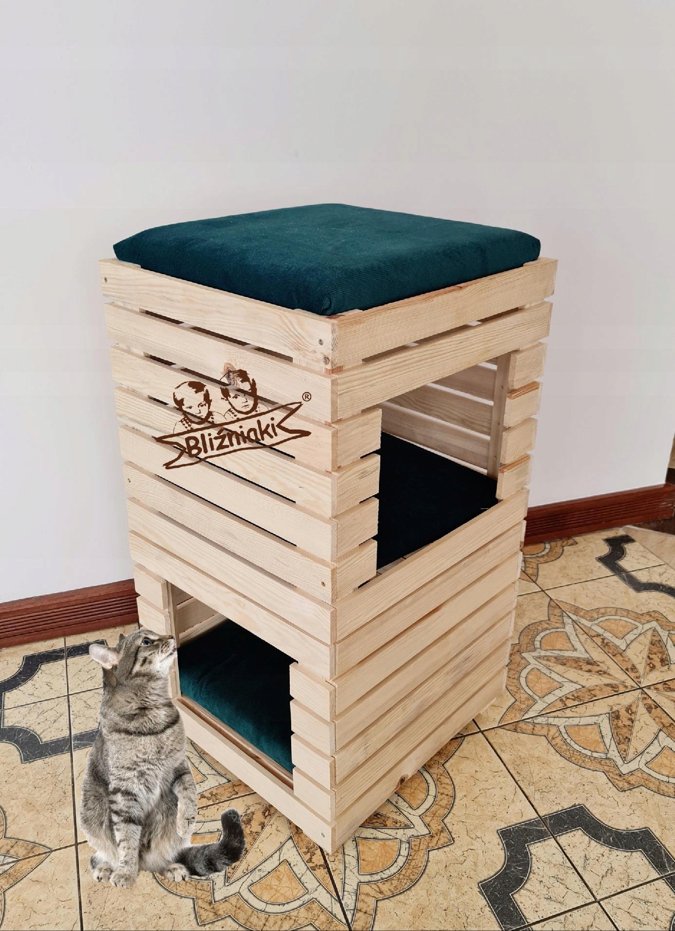 Wysoka Budka Domek dla Kota z Trzema Piętrami Legowisko z Drewna dla Kotów (DOMKOT5 N OBICIE K)