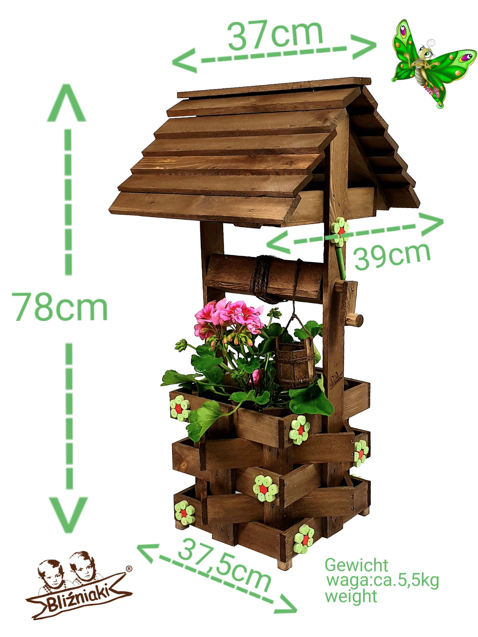 Nasza dekoracyjna studnia w kolorze ORZECHOWYM wykonana z suszonego drewna sosnowego to nie tylko piękny element dekoracyjny, ale również wyraz ekologicznego podejścia do projektowania ogrodów.