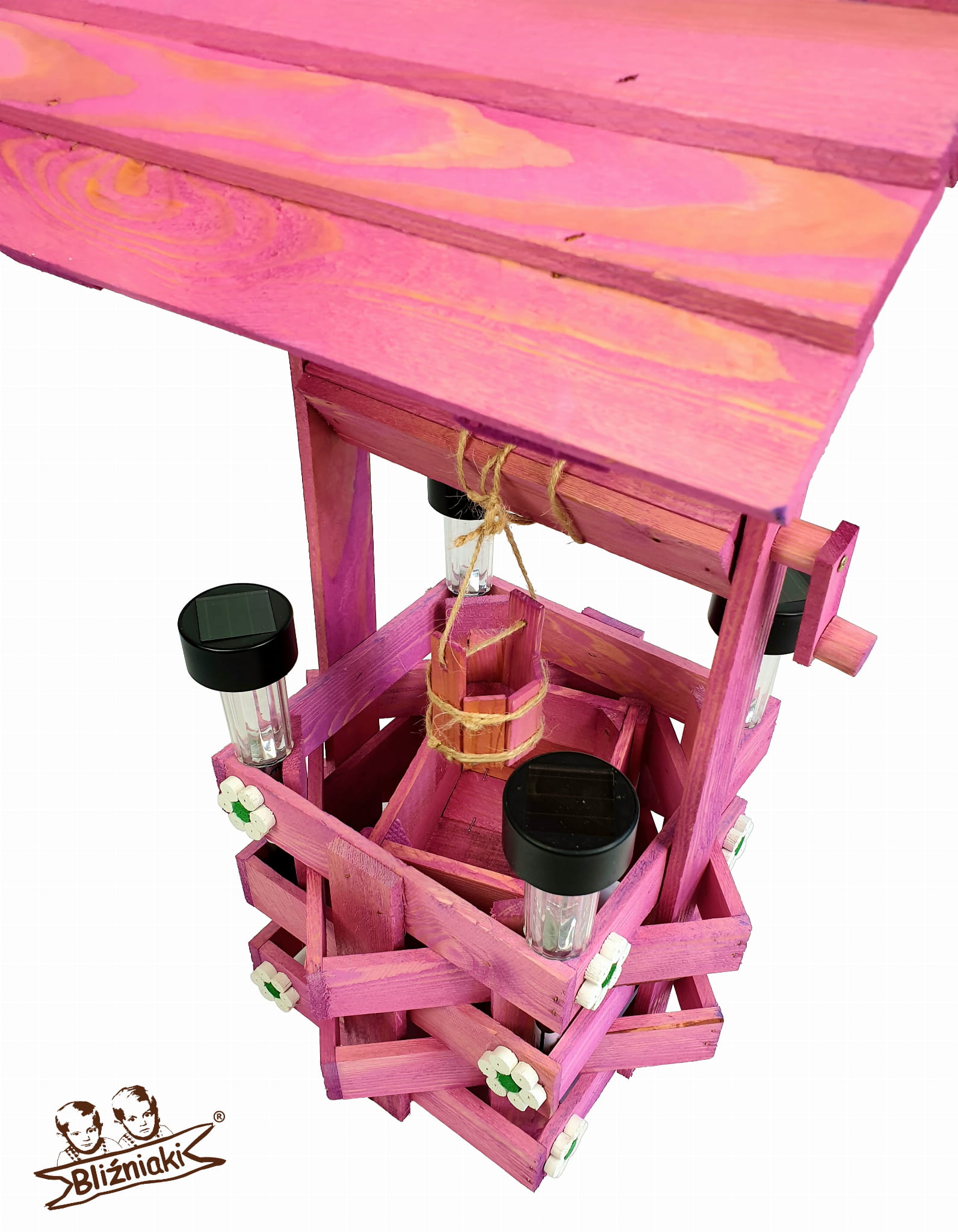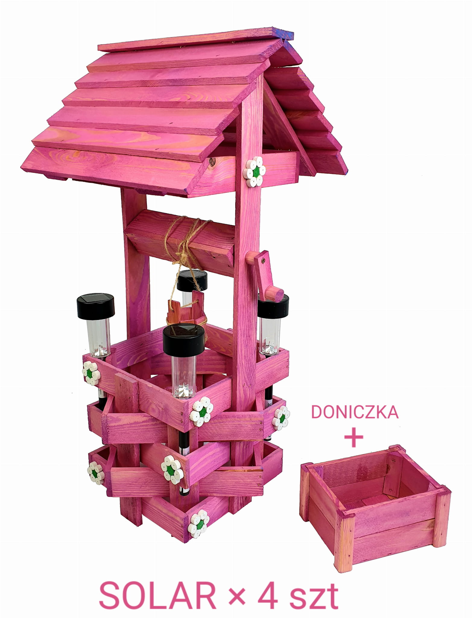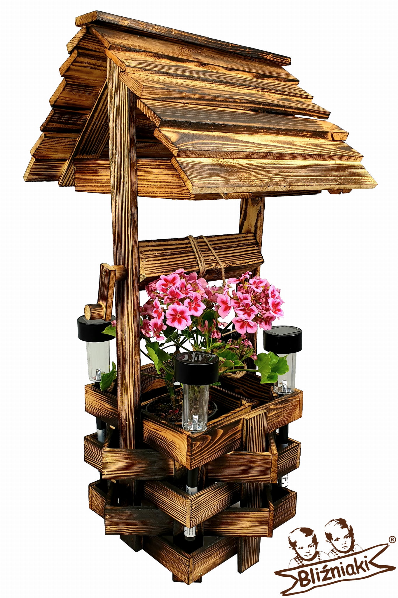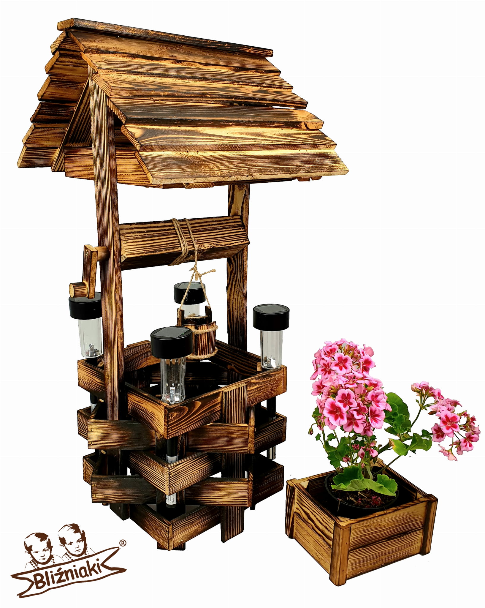 Nasze studnie wyposażone są w dekoracyjną doniczkę na Twoje ulubione kwiaty, ozdobne wiaderko, kołowrotek oraz 4 lampy solarne.