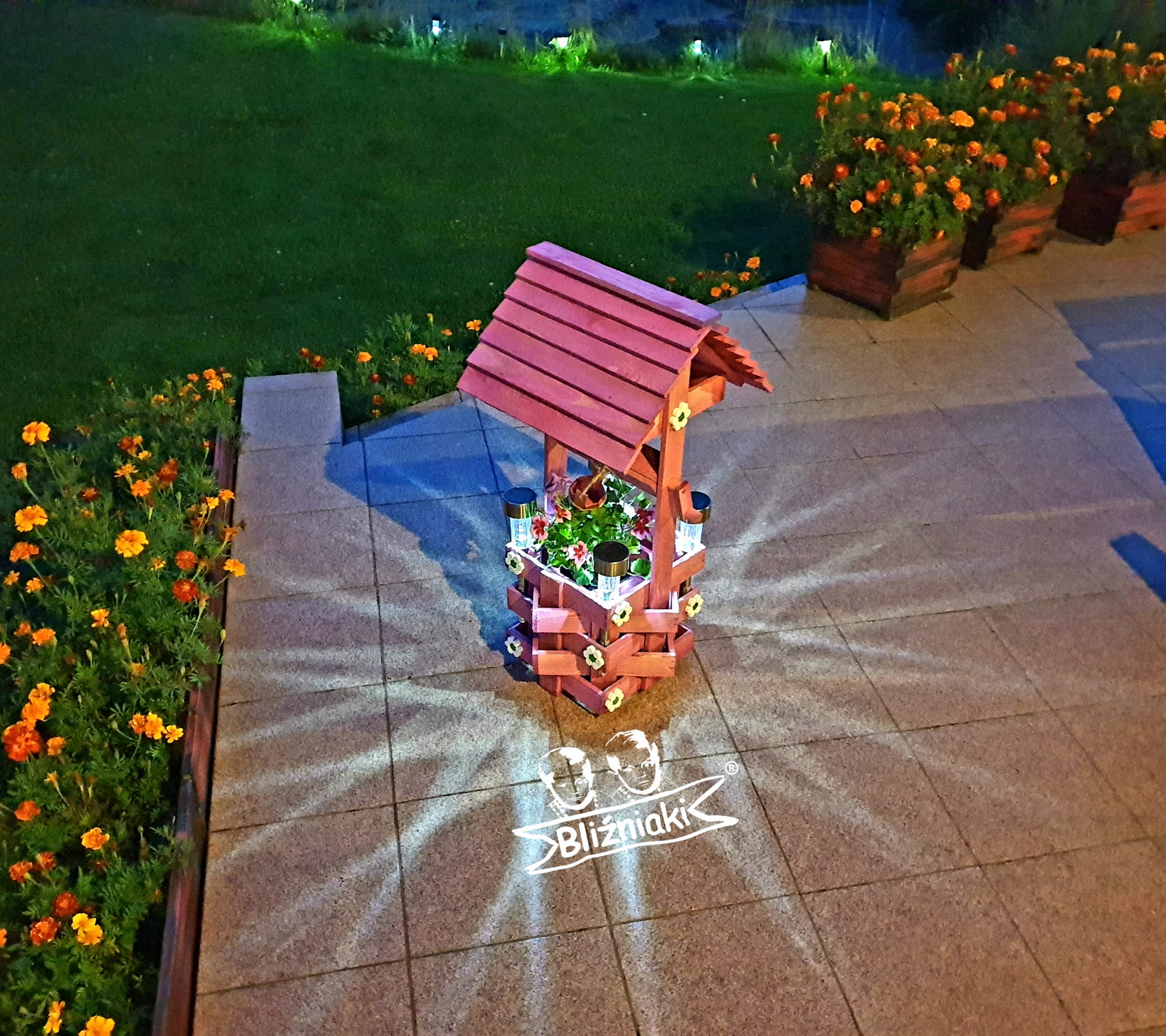Nasze studnie świetnie prezentują się zarówno w dzień jak i w nocy. Zapewniają to 4 lampy SOLAROWE.