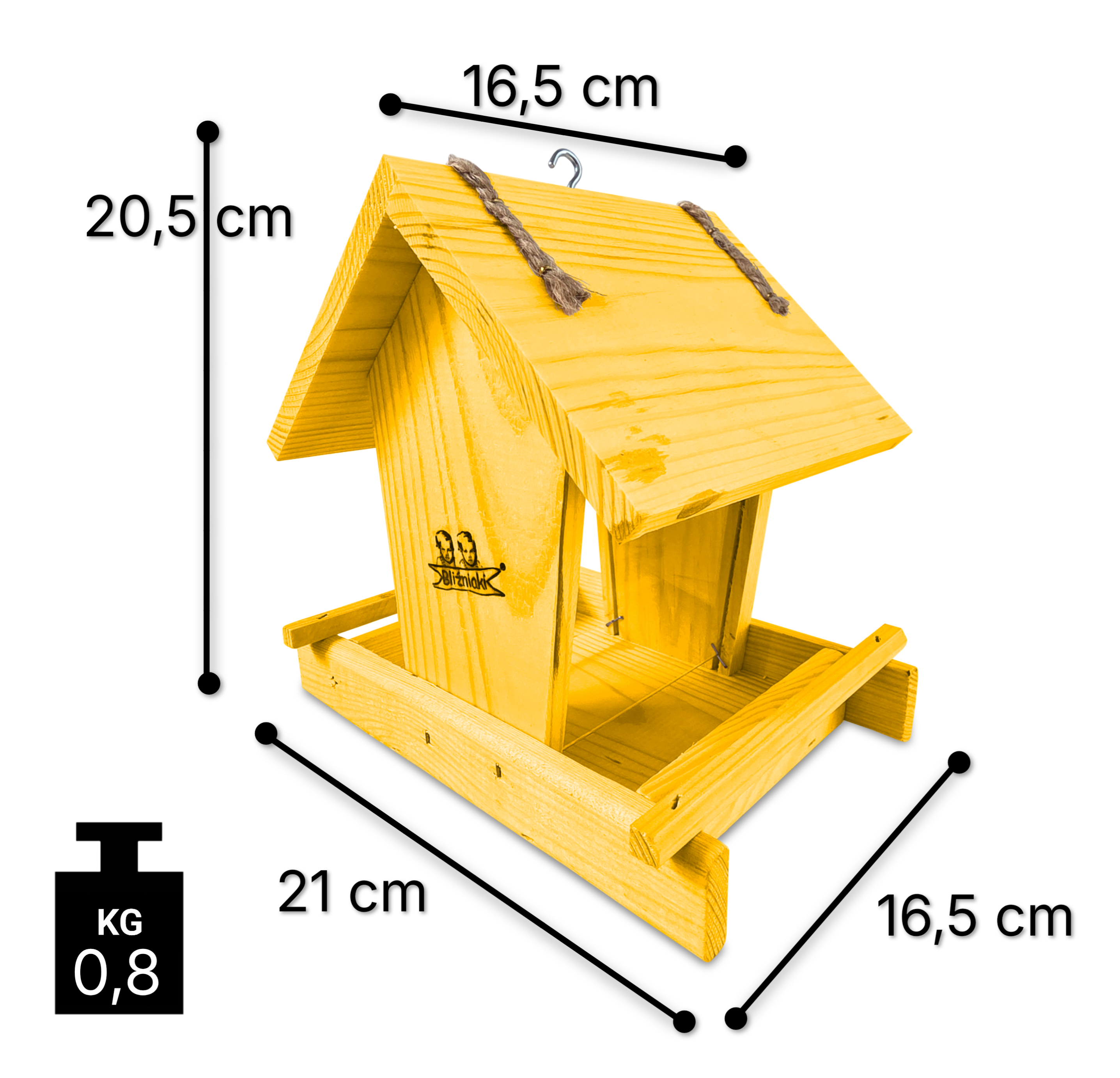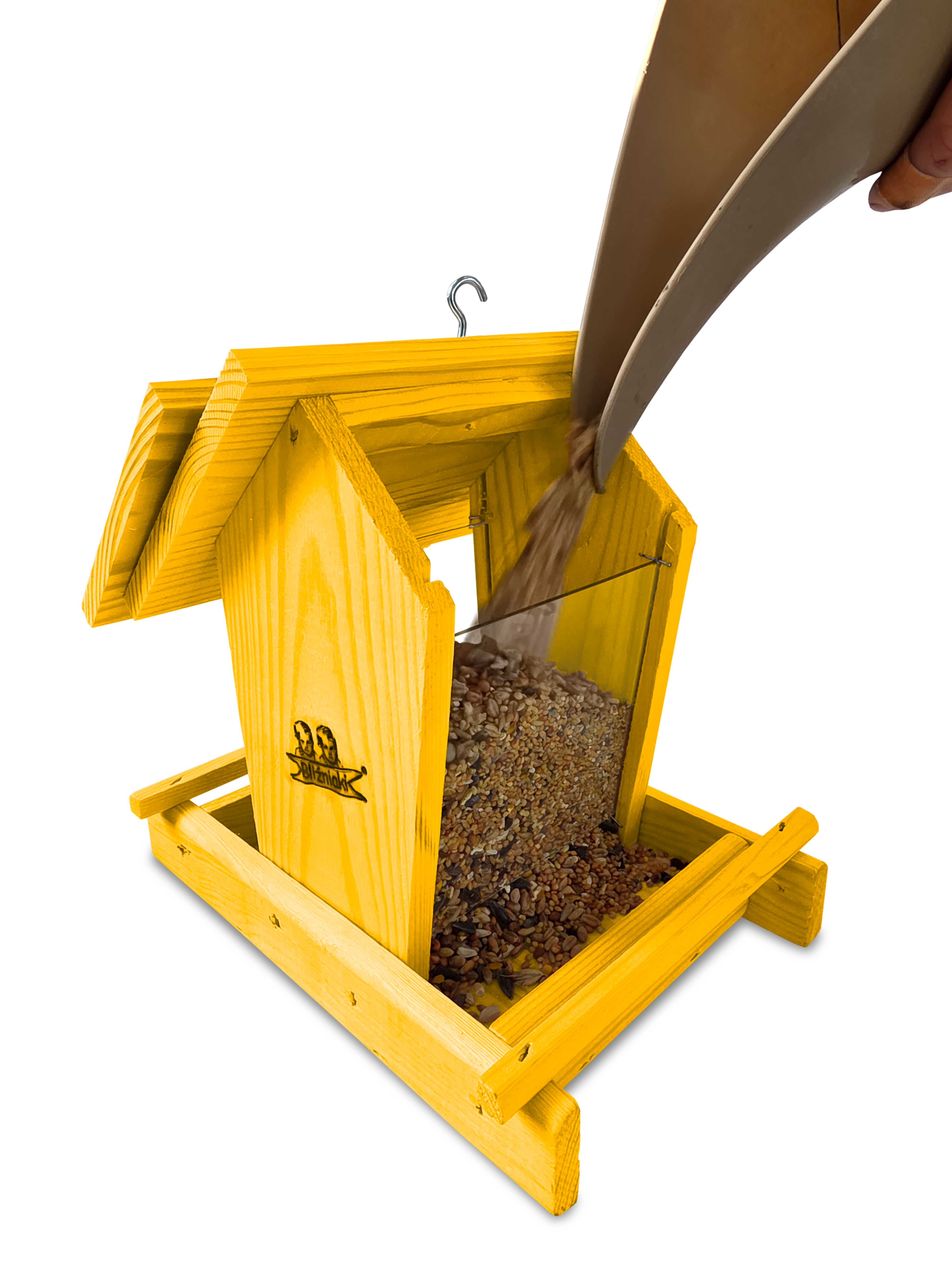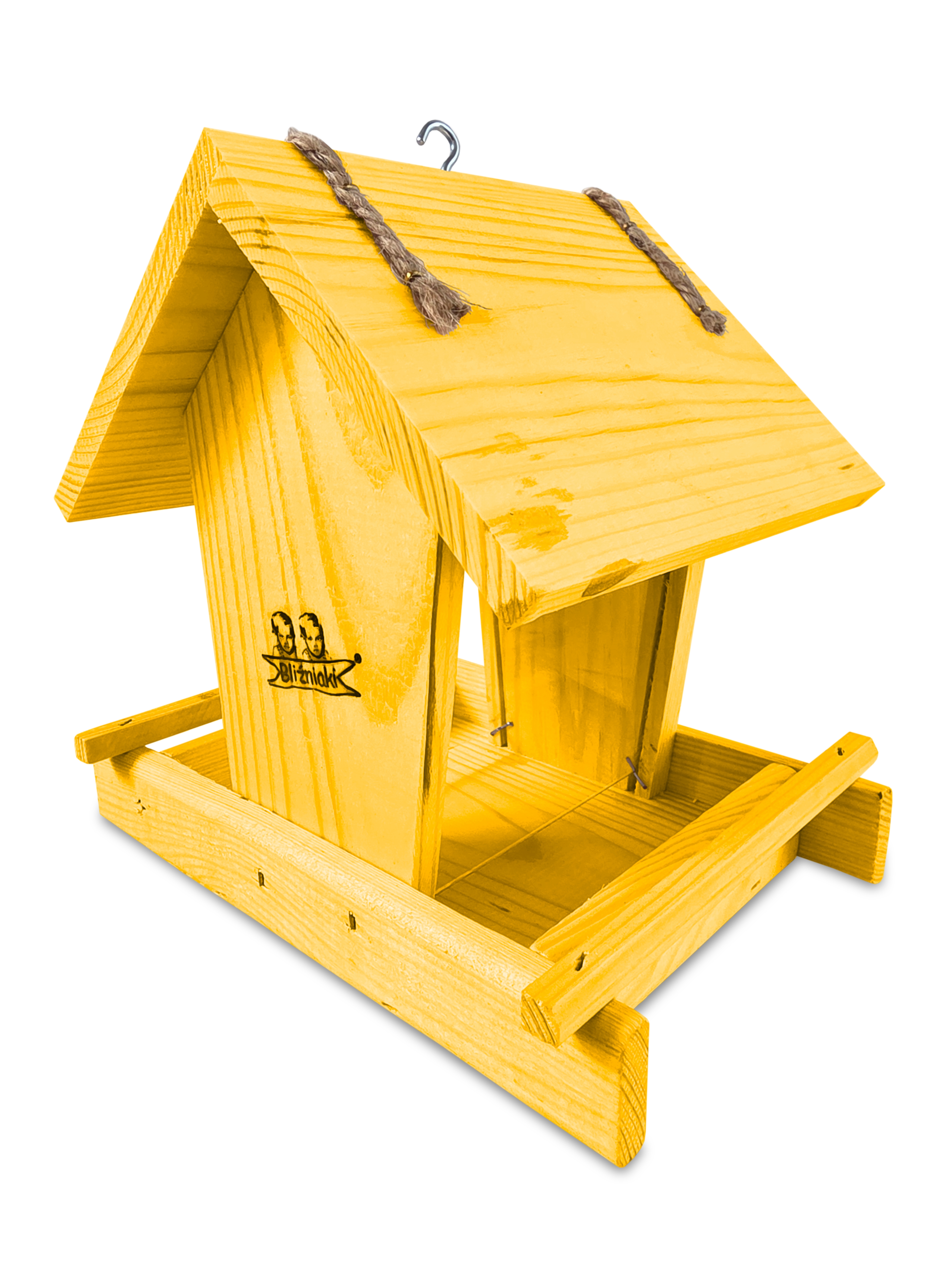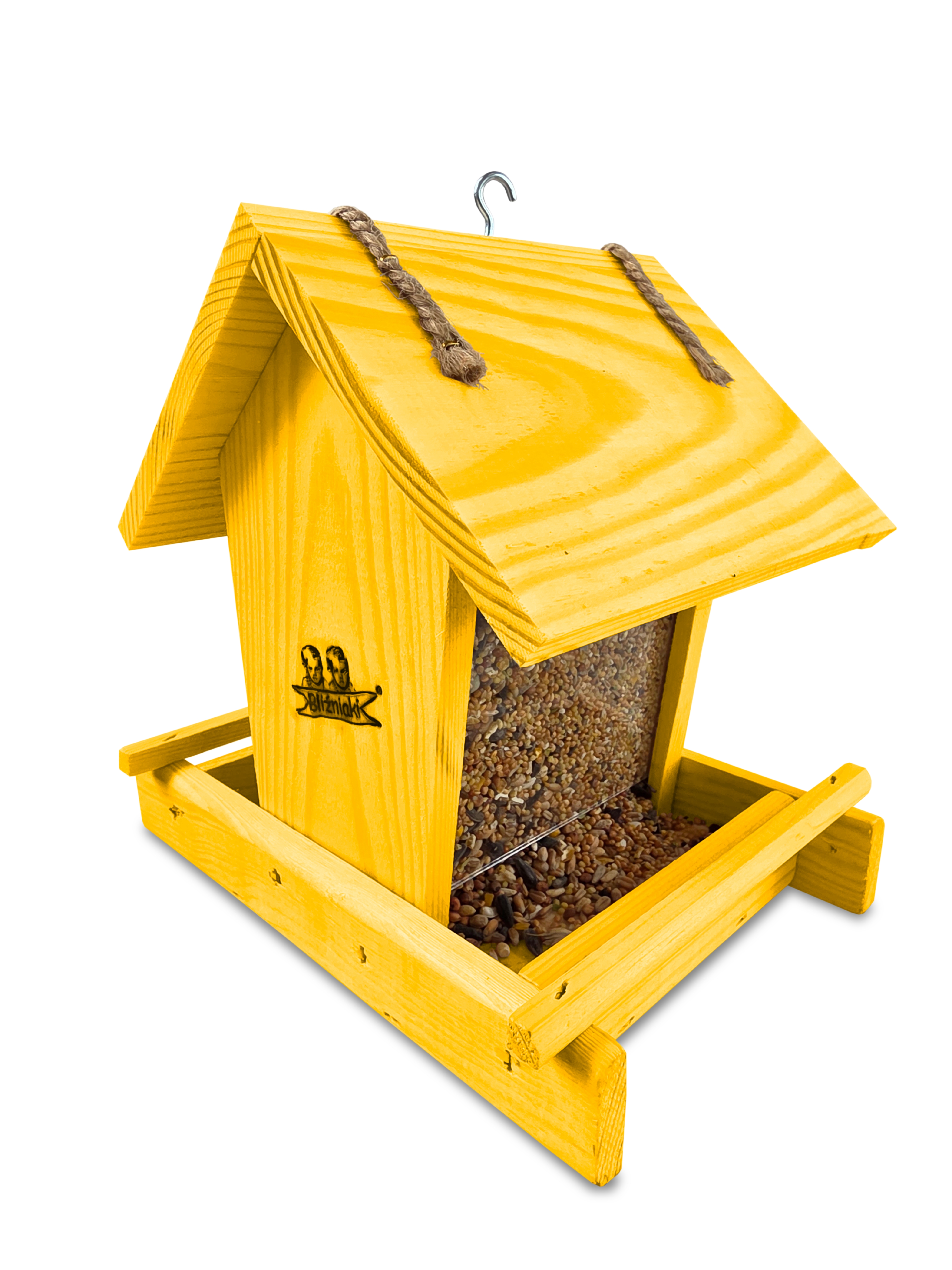 Przedmiotem sprzedaży jest ozdobny drewniany Karmnik dla ptaków z dozownikiem ziarna model K29 ZB w kolorze żółtym