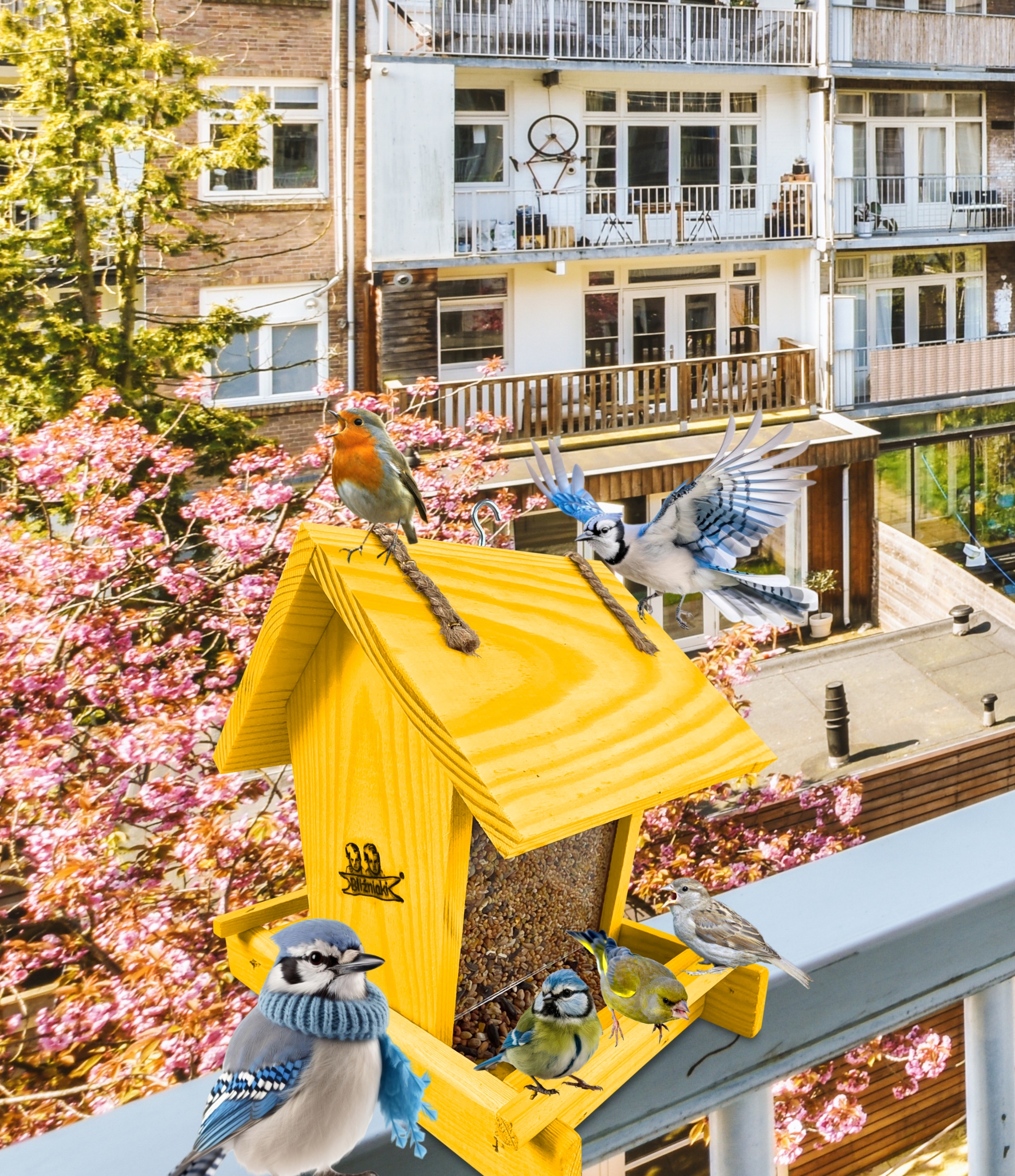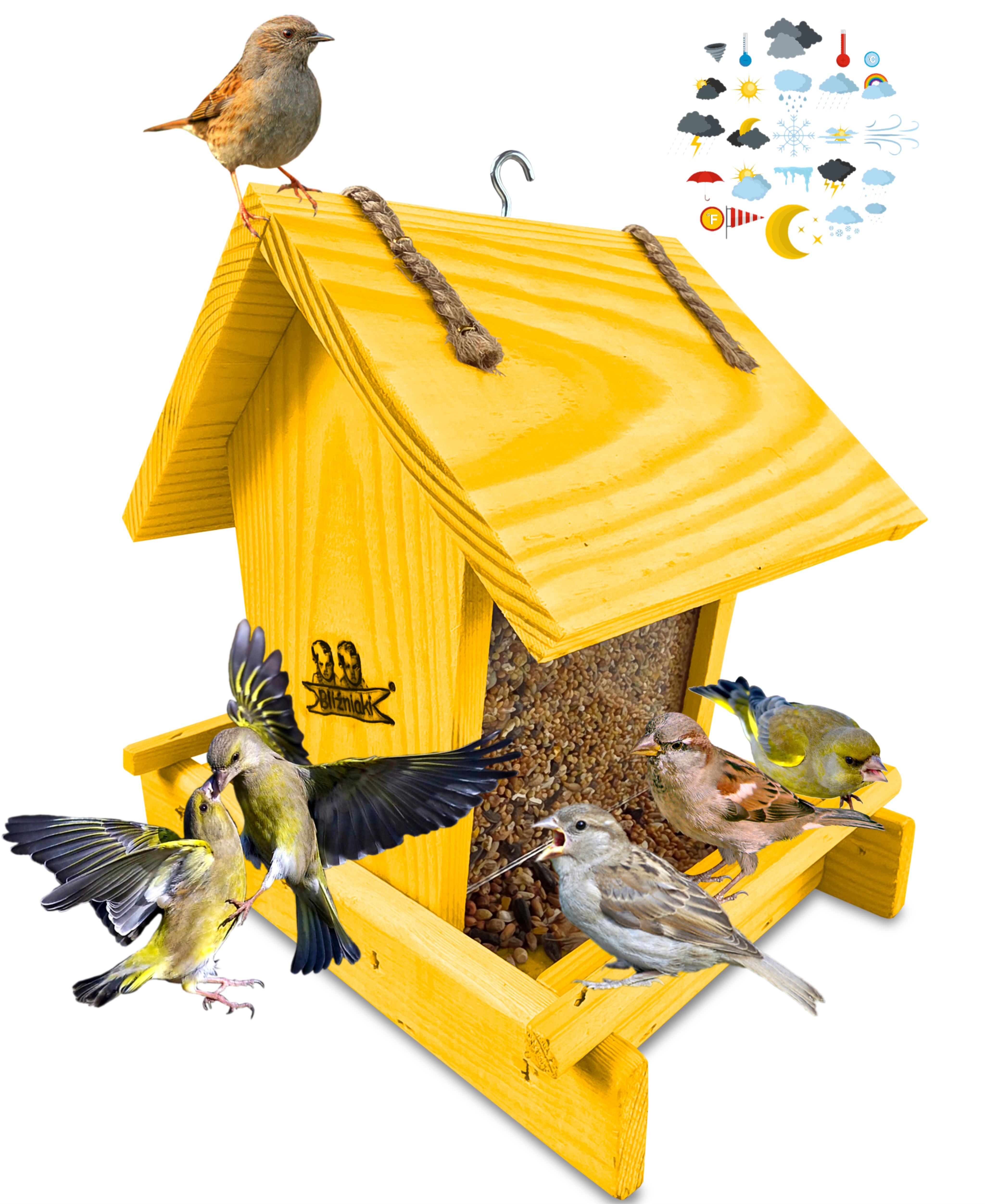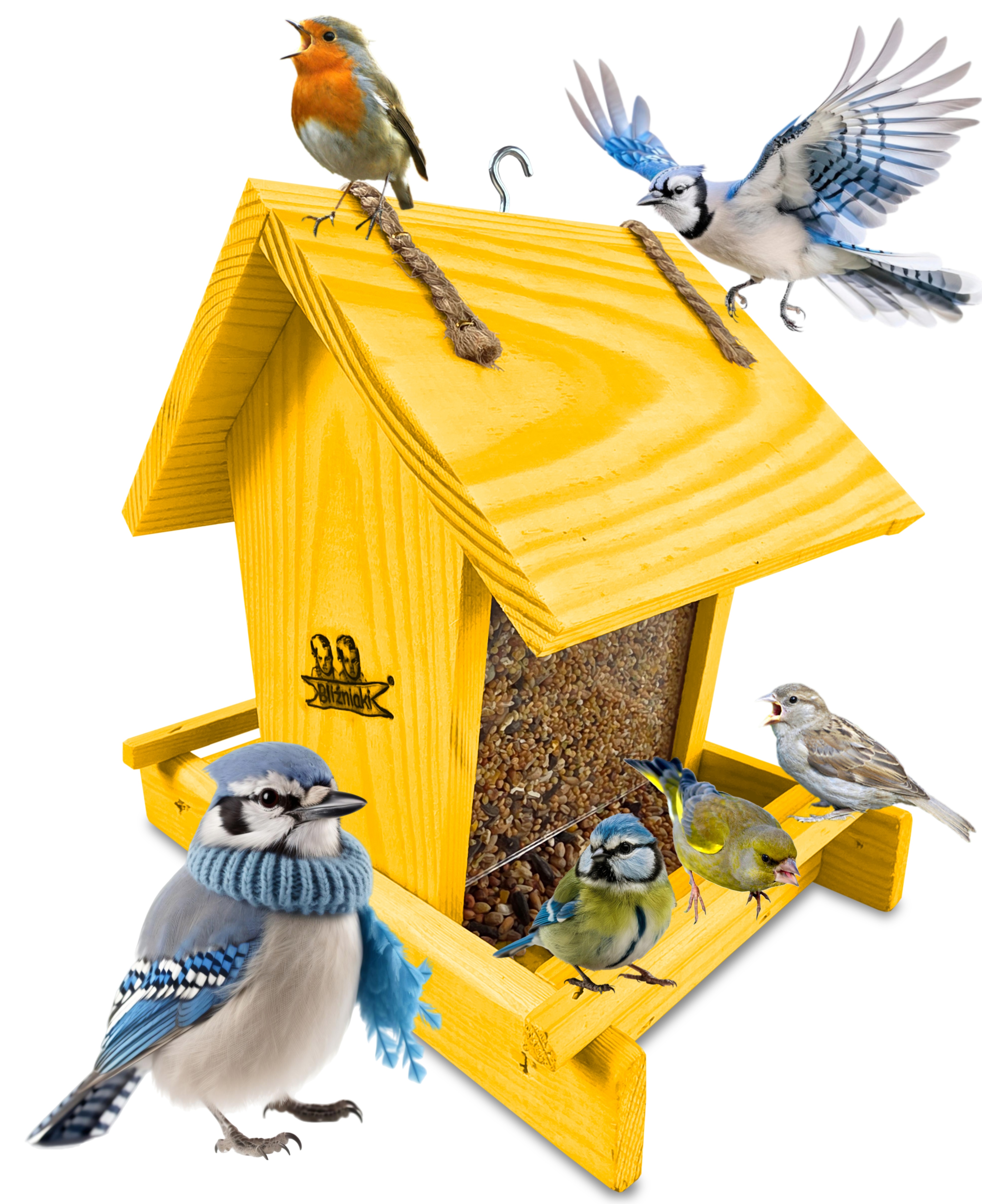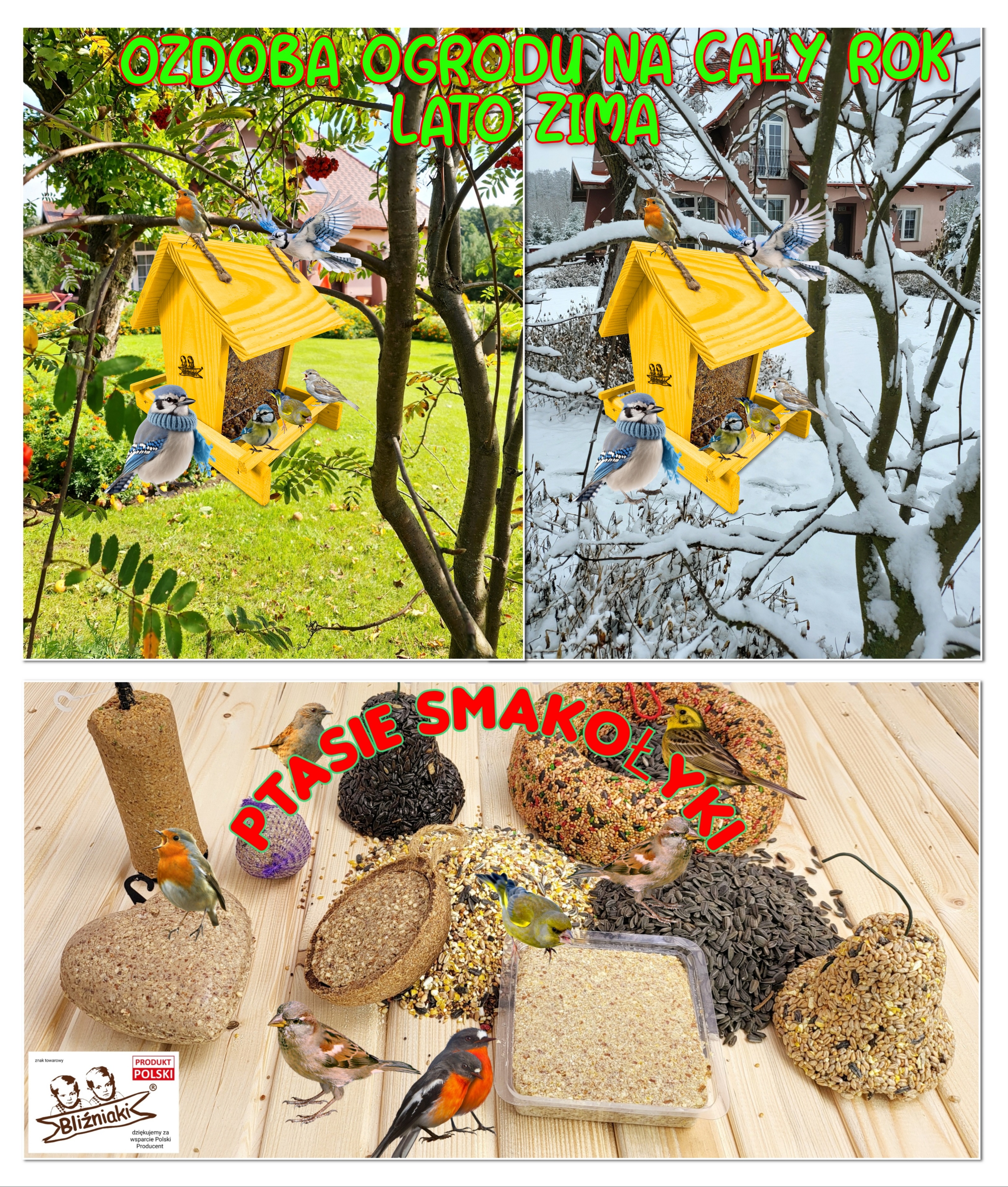 Przedmiotem sprzedaży jest ozdobny drewniany Karmnik dla ptaków z dozownikiem ziarna model K29 ZB w kolorze żółtym