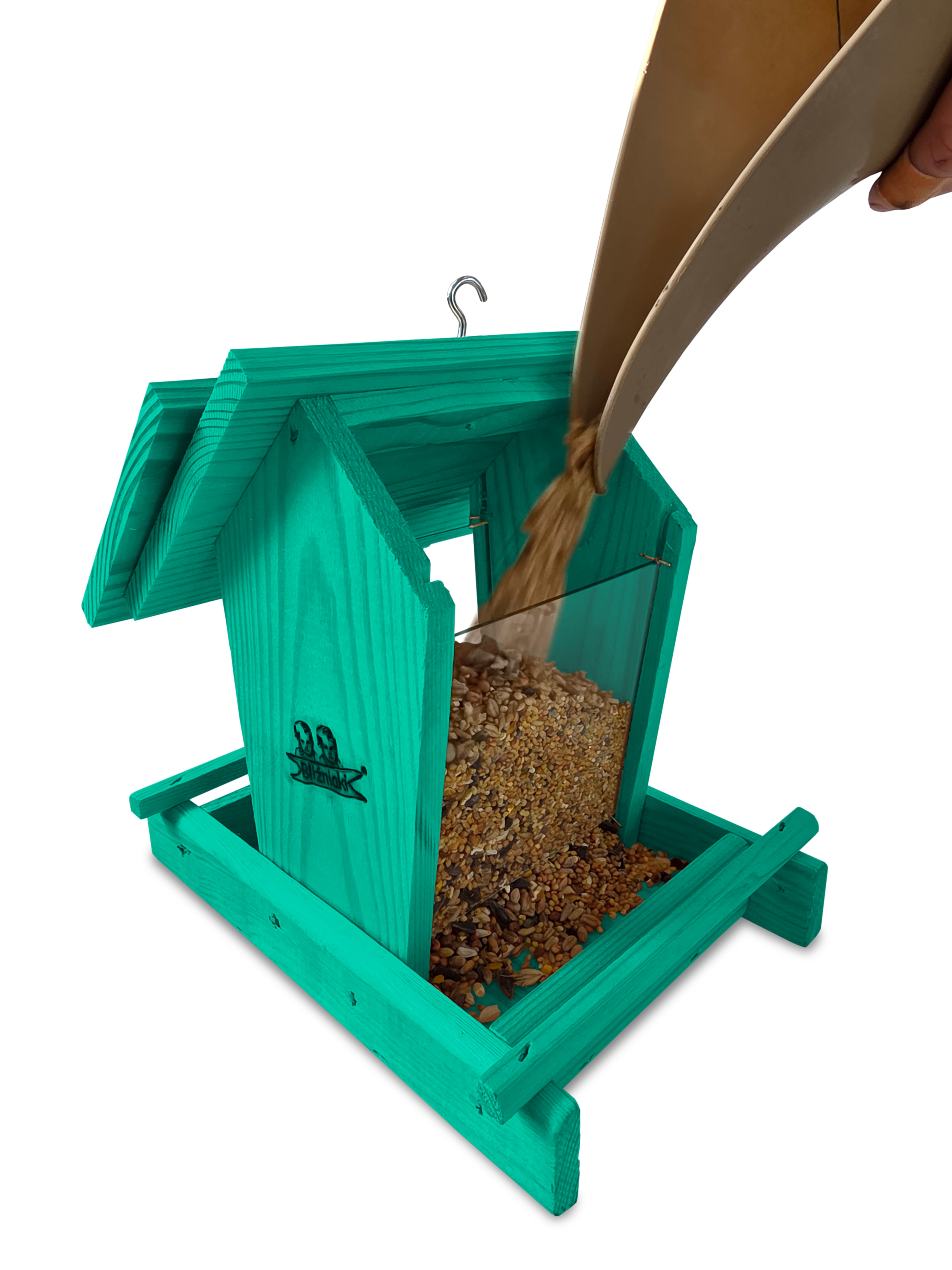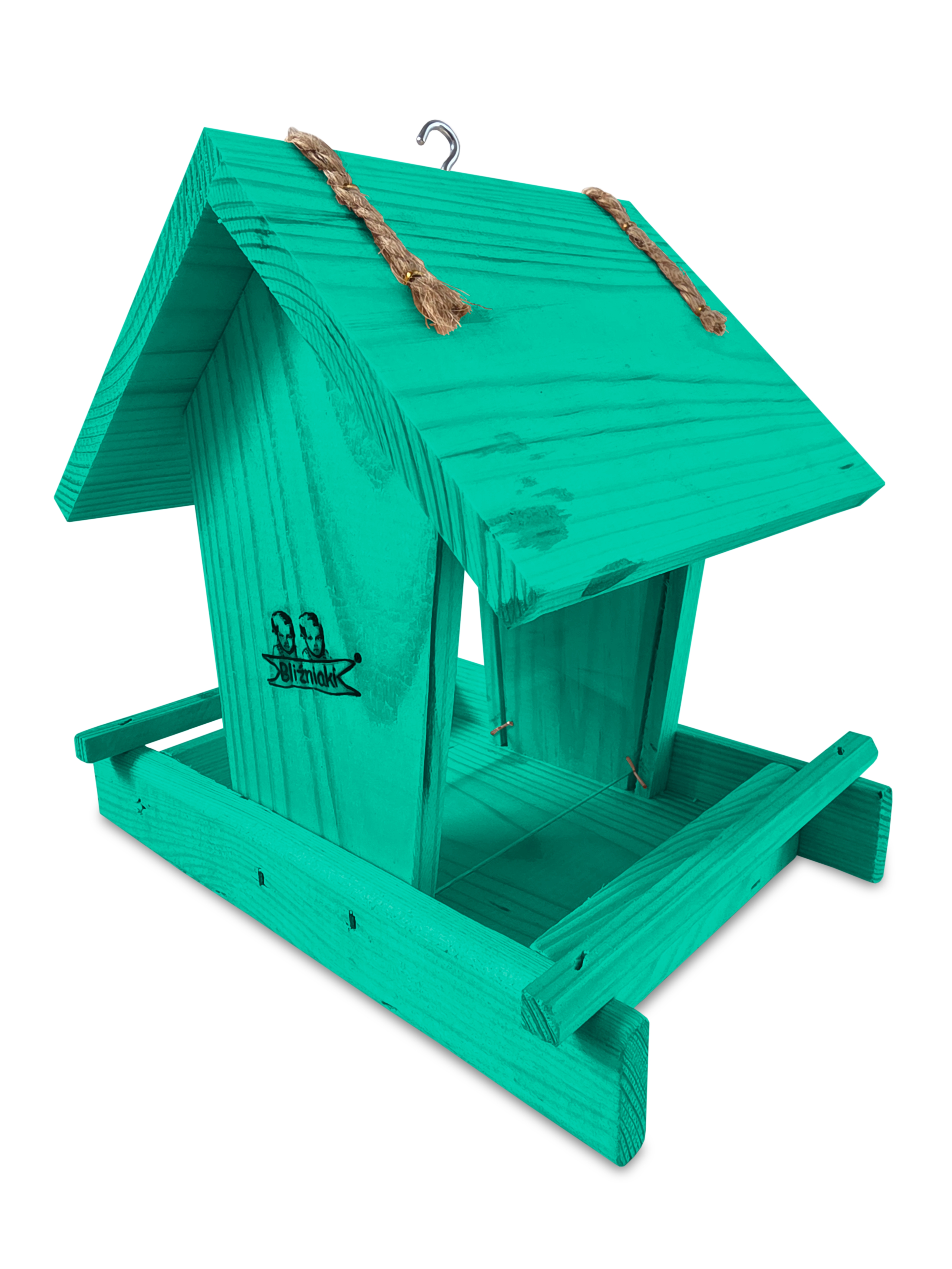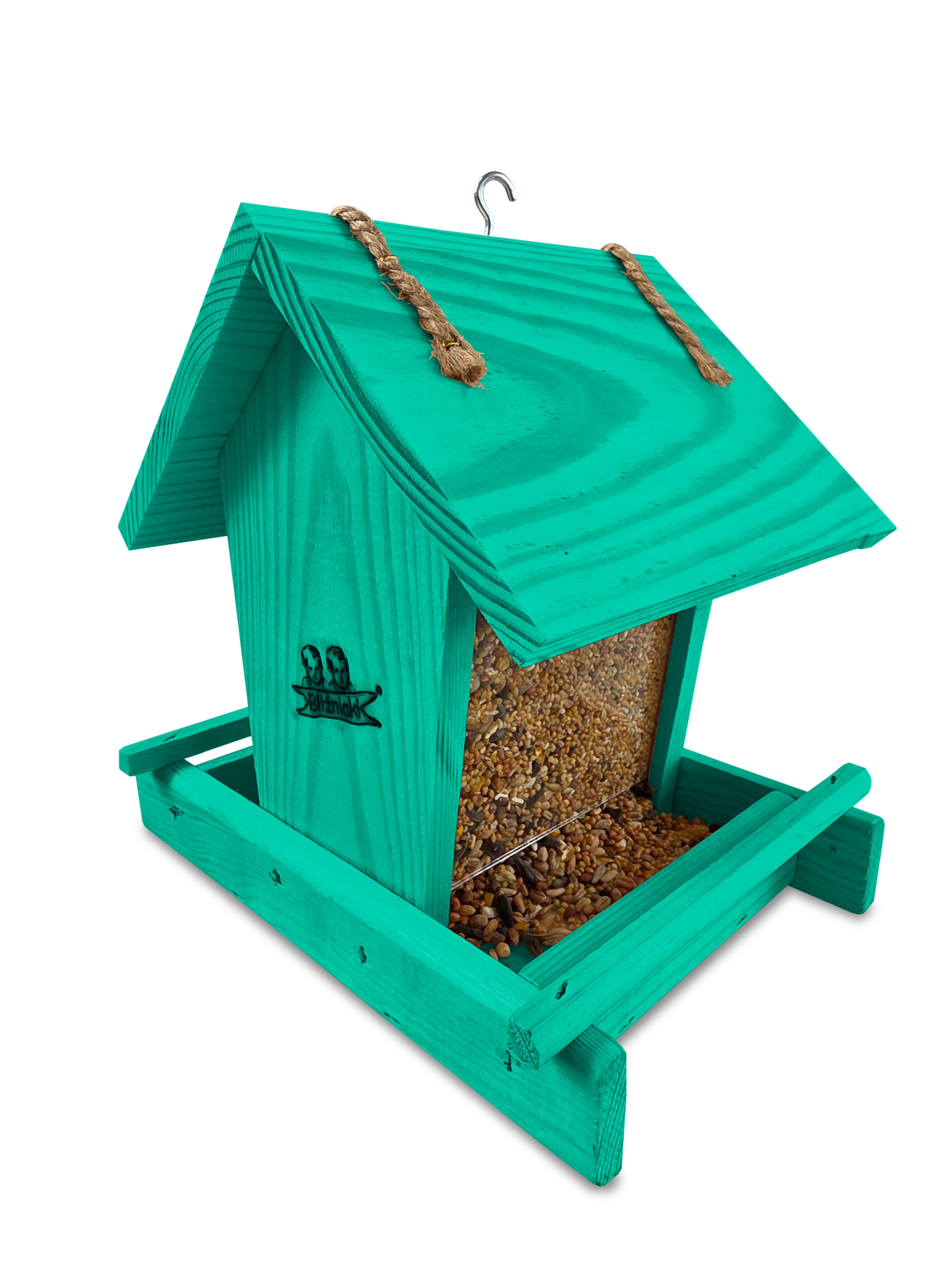 Przedmiotem sprzedaży jest ozdobny drewniany karmnik dla ptaków z dozownikiem ziarna model K29 MR w kolorze morskiej zieleni