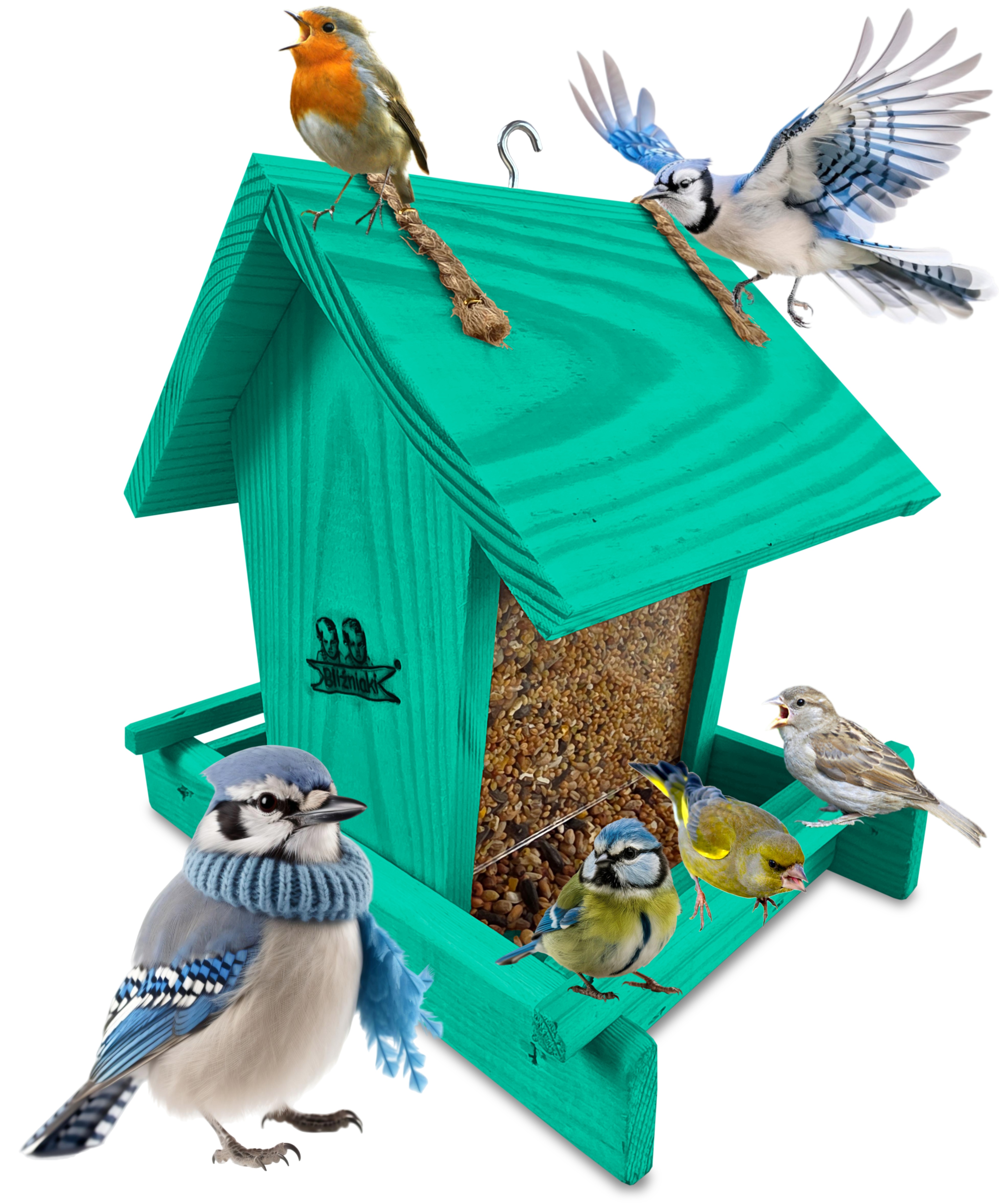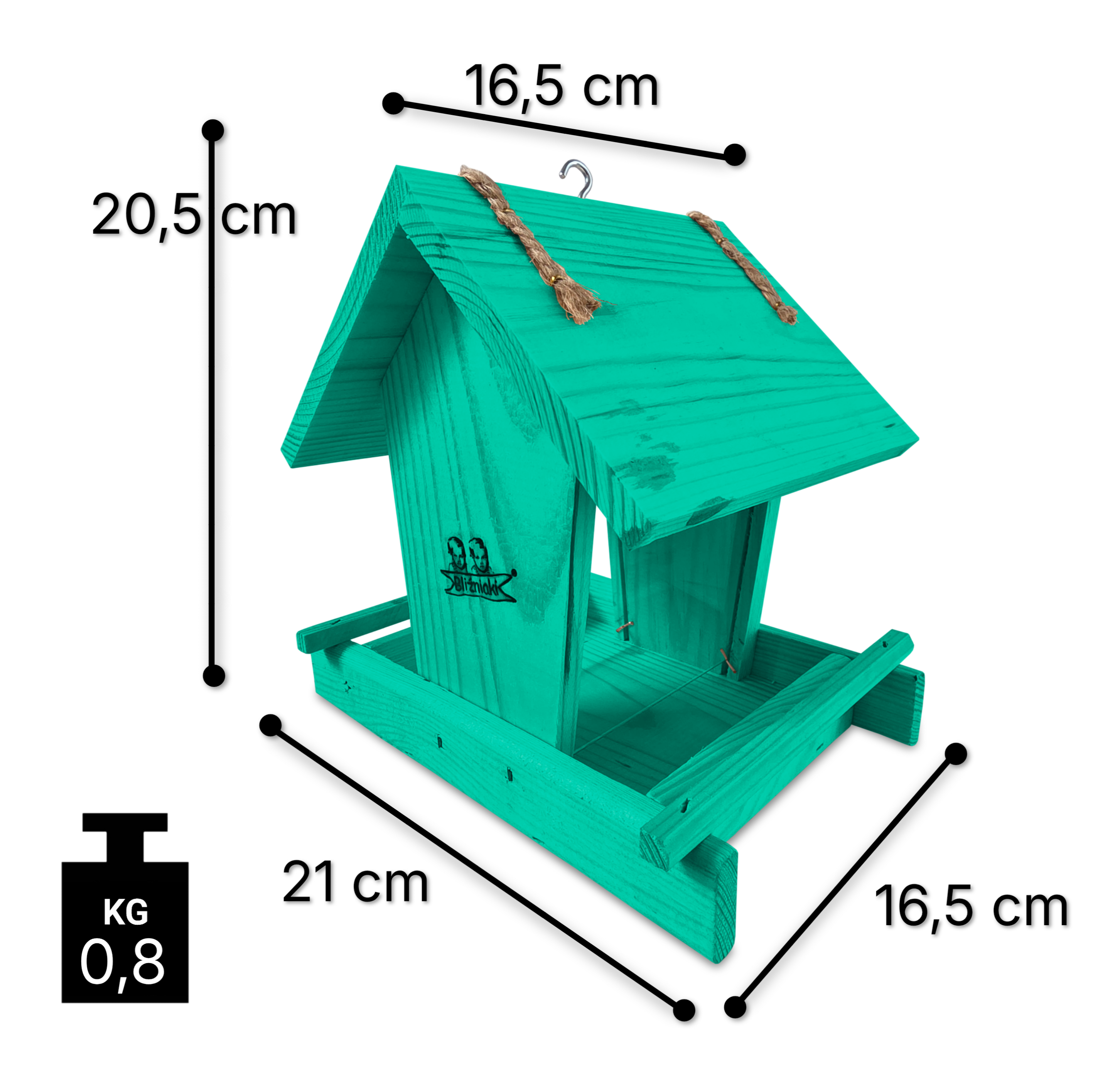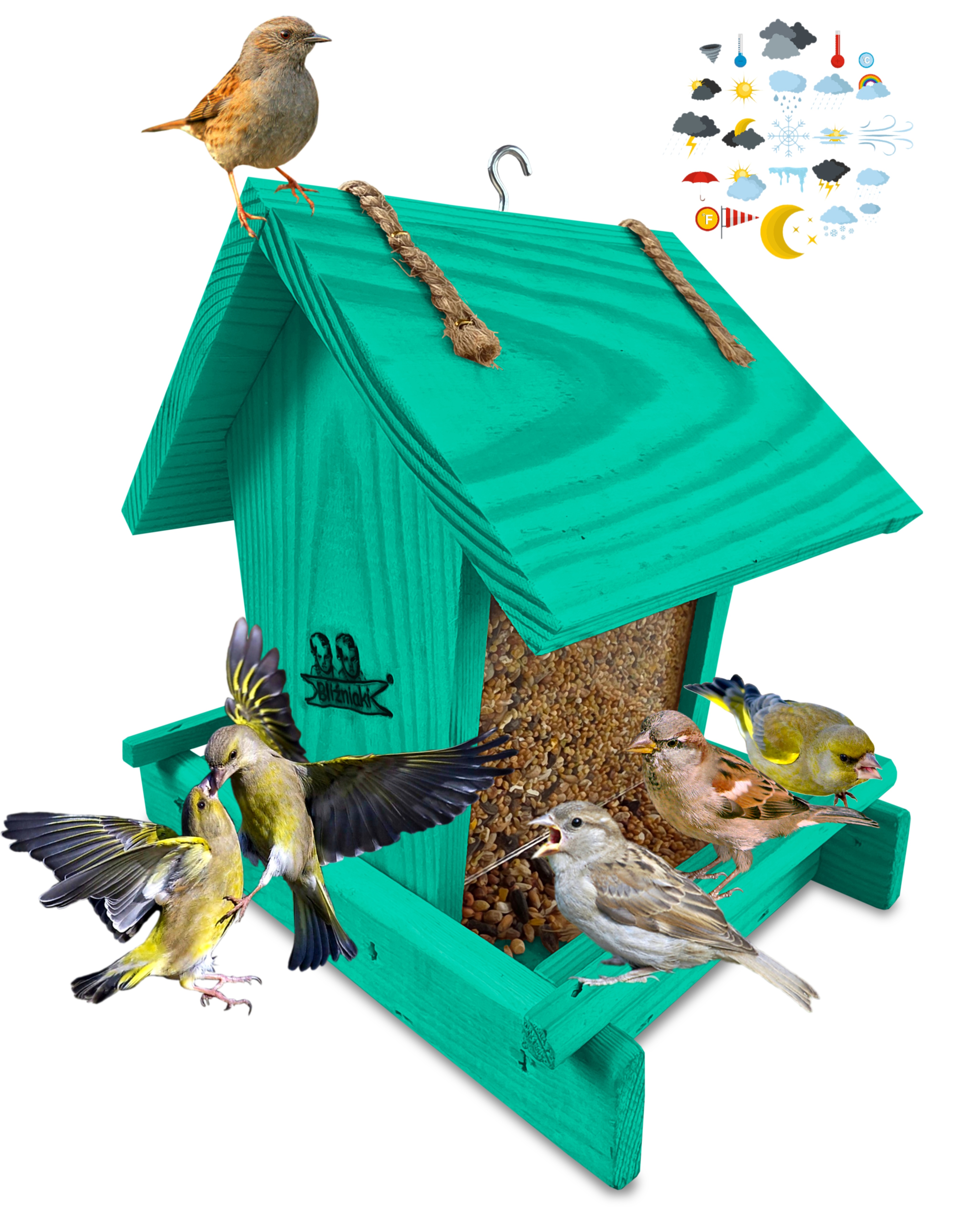 Przedmiotem sprzedaży jest ozdobny drewniany karmnik dla ptaków z dozownikiem ziarna model K29 MR w kolorze morskiej zieleni