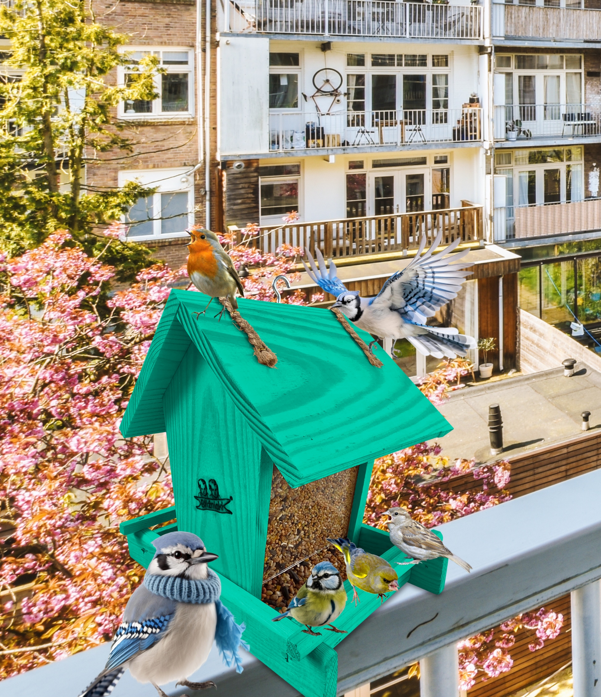 Karmnik posiada haczyk, umożliwiający zawieszenie go na balkonie, drzewie, pod dachem altany. Dzięki temu przylatujące do niego ptaki nie staną się łatwym kąskiem dla kotów i innych zwierząt. Dzięki małym gabarytom, z łatwością można wkomponować go w elementy architektury ogrodowej, na balkonie czy nawet parapecie.
